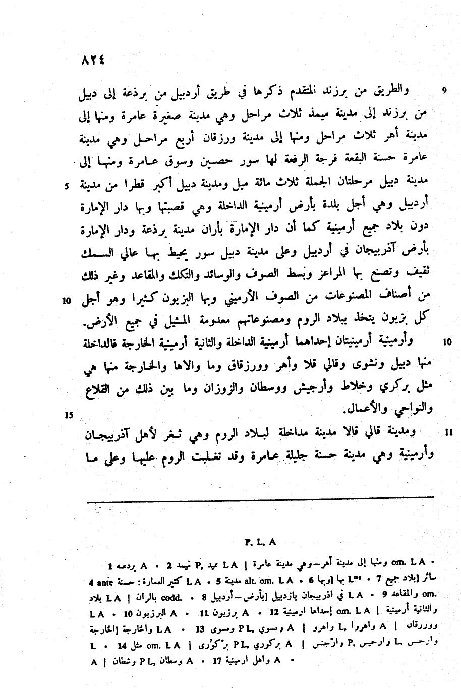 وأرمينية أرمينيتان إحداهما أرمينية الداخلة والثانية أرمينية الخارجة فالداخلة منها دبيل ونشوى وقالي قلا وأهر وورزقاق وما والاها والخارجة منها هي مثل بركري وخلاط وأرجيش ووسطان والزوزان وما بين ذلك من القلاع والنواحي والأعمال.