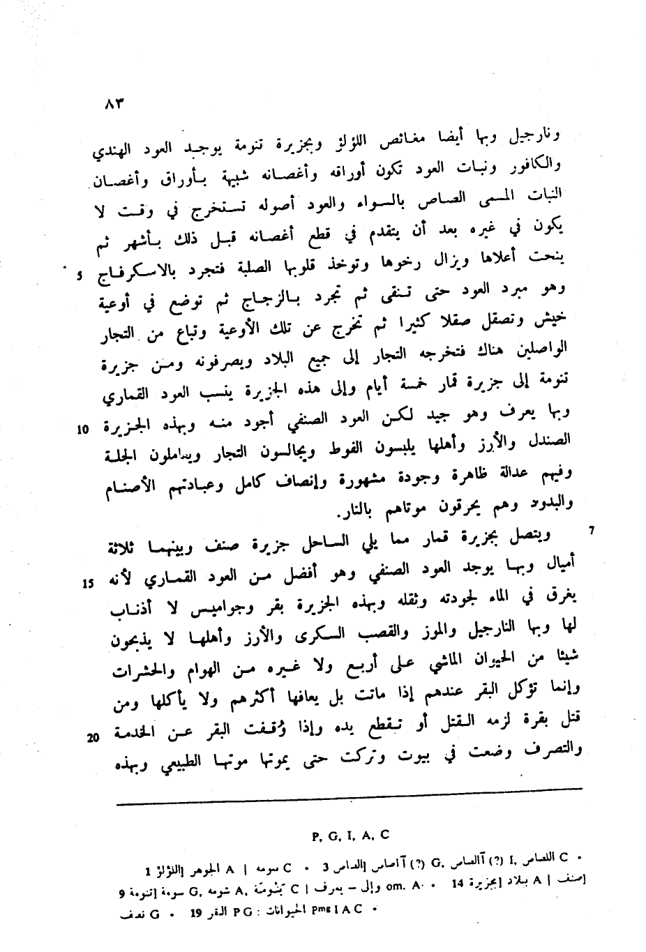 ونارجيل وبها أيضا مغائص اللؤلؤ وبجزيرة تنومة يوجد العود الهندي والكافور ونبات العود تكون أوراقه وأغصانه شبيهة بأوراق وأغصان النبات المسمى الصاص بالسواد والعود أصوله تستخرج في وقت لا يكون في غيره بعد أن يتقدم في قطع أغصانه قبل ذلك بأشهر ثم ينحت أعلاها ويزال رخوها وتوخذ قلوبها الصلبة فتجرد بالاسكرفاج وهو مبرد العود حتى تنقى ثم تجرد بالزجاج ثم توضع في أوعية خيش وتصقل صقلا كثيرا ثم تخرج عن تلك الأوعية وتباع من التجار الواصلين هناك فتخرجه التجار إلى جميع البلاد ويصرفونه ومن جزيرة تنومة إلى جزيرة قمار خمسة أيام وإلى هذه الجزيرة ينسب العود القماري وبها يعرف وهو جيد لكن العود الصنفي أجود منه وبهذه الجزيرة الصندل والأرز وأهلها يلبسون الفوط ويجالسون التجار ويعاملون الجلة وفيهم عدالة ظاهرة وجودة مشهورة وإنصاف كامل وعبادتهم الأصنام والبدود وهم يحرقون موتاهم بالنار.