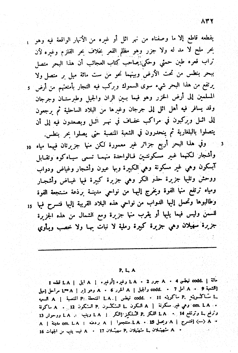 يقطعه قاطع إلا ما وصفناه من نهر اثل أو غيره من الأنهار الواقعة فيه وهو بحر ملح لا مد له ولا جزر وهو مظلم القعر بخلاف بحر القلزم وغيره لأن تراب قعره طين حمئي وحكى صاحب كتاب العجائب أن هذا البحر متصل ببحر بنطس من تحت الأرض وبينهما نحو من ست مائة ميل بر متصل ولا يرتفع من هذا البحر شيء سوى السموك ويركب فيه التجار بأمتعتهم من أرض المسلمين إلى أرض الخزر وهو فيما بين الران والجيل وطبرستان وجرجان وقد يسافر فيه أهل اثل إلى جرجان وغيرها من البلاد الساحلية ثم يرجعون إلى اثل ويركبون في مراكب خفاف في نهر اثل ويصعدون فيه إلى أن يتصلوا بالبلغارية ثم ينحدرون في الشعبة المنصبة حتى يصلوا بحر بنطس.