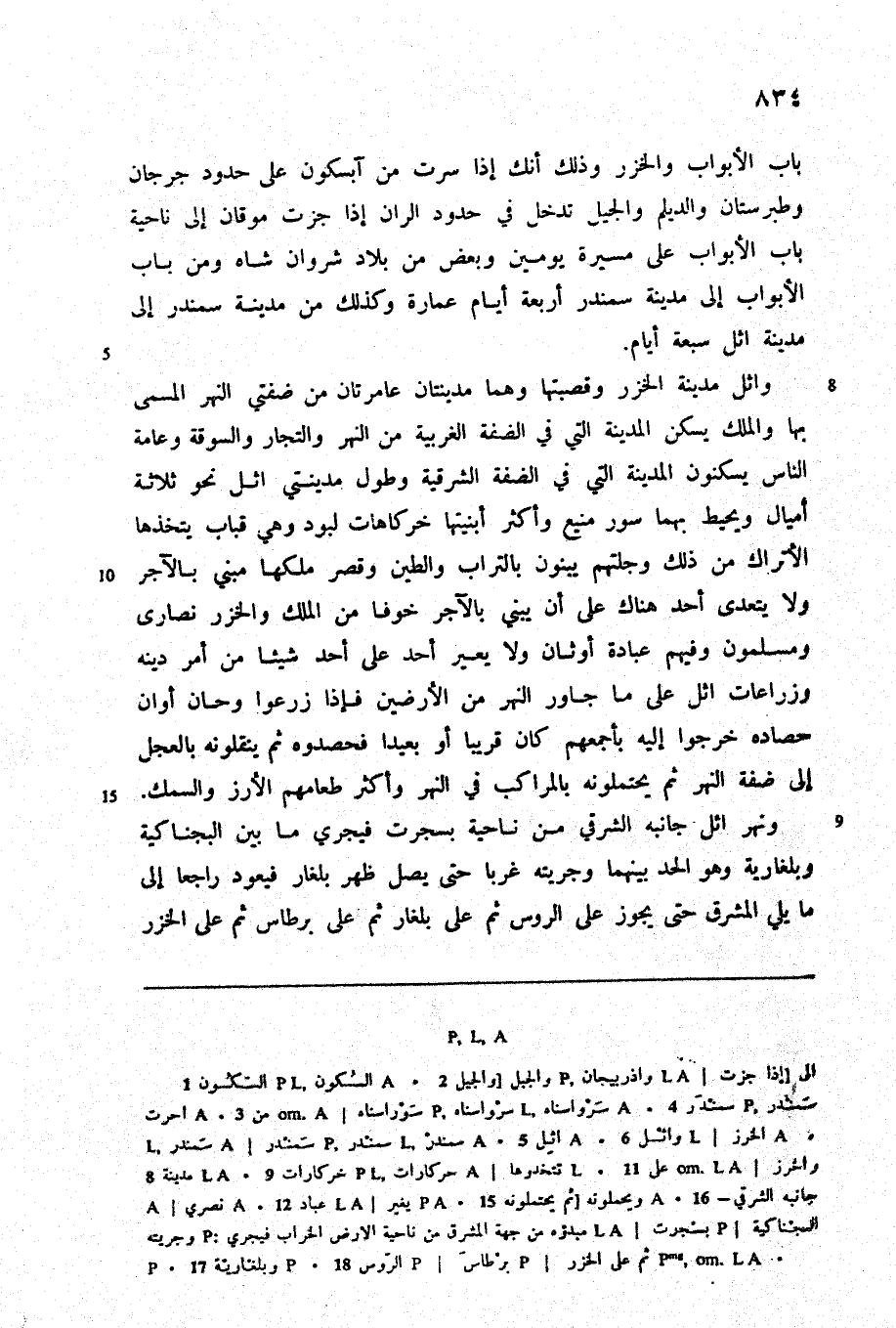باب الأبواب والخزر وذلك أنك إذا سرت من آبسكون على حدود جرجان وطبرستان والديلم والجيل تدخل في حدود الران إذا جزت موقان إلى ناحية باب الأبواب على مسيرة يومين وبعض من بلاد شروان شاه ومن باب الأبواب إلى مدينة سمندر أربعة أيام عمارة وكذلك من مدينة سمندر إلى مدينة اثل سبعة أيام.