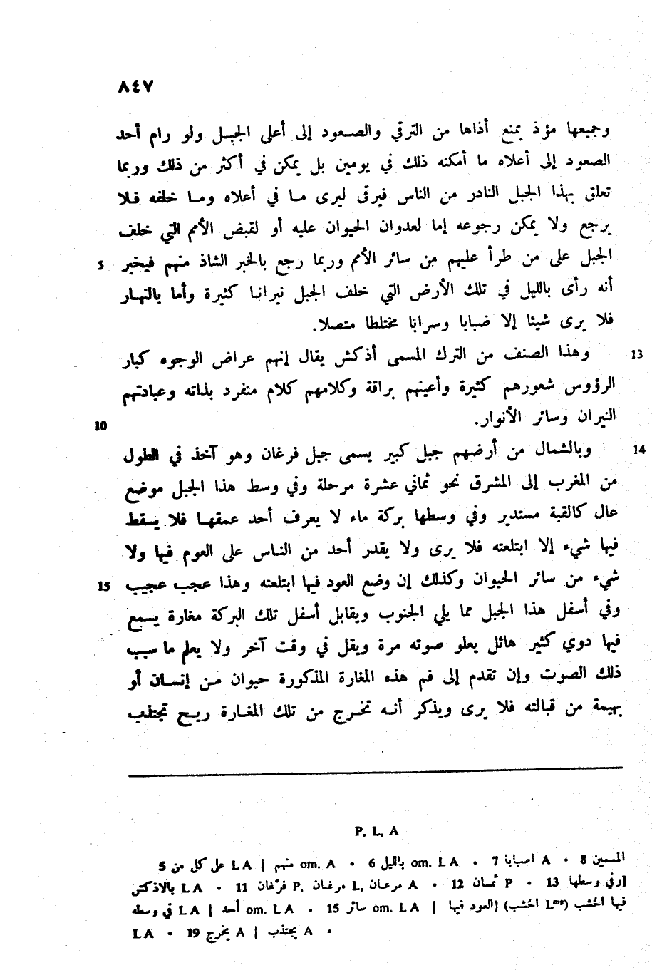 وجميعها مؤذ يمنع أذاها من الترقي والصعود إلى أعلى الجبل ولو رام أحد الصعود إلى أعلاه ما أمكنه ذلك في يومين بل يمكن في أكثر من ذلك وربما تعلق بهذا الجبل النادر من الناس فيرقى ليرى ما في أعلاه وما خلفه فلا يرجع ولا يمكن رجوعه إما لعدوان الحيوان عليه أو لقبض الأمم التي خلف الجبل على من طرأ عليهم من سائر الأمم وربما رجع بالخبر الشاذ منهم فيخبر أنه رأى بالليل في تلك الأرض التي خلف الجبل نيرانا كثيرة وأما بالنهار فلا يرى شيئا إلا ضبابا وسرابا مختلطا متصلا.