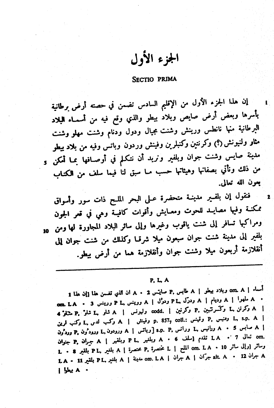 إن هذا الجزء الأول من الإقليم السادس تضمن في حصته أرض برطانية بأسرها وبعض أرض صايص وبلاد بيطو والذي وقع فيه من أسماء البلاد البرطانية منها نانطس ورينش وشنت مجيال ودول ودنام وشنت مهلو وشنت مثاو ولنيونش (؟) وكرنتين وكنبلرين وفينش وردون وباتس وفيه من بلاد بيطو مدينة صايس وشنت جوان وبلفير ونريد أن نتكلم في أوصافها بما أمكن من ذلك ونأتي بصفاتها وهيئاتها حسب ما سبق لنا فيما سلف من الكتاب بعون الله تعالى.