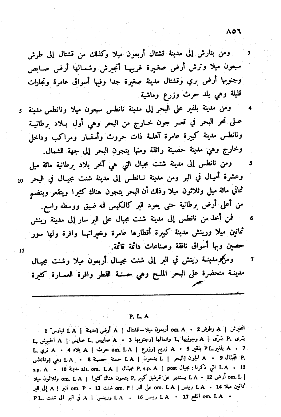 ومن مدينة بلفير على البحر إلى مدينة نانطس سبعون ميلا ونانطس مدينة على نحر البحر في قعر جون خارج من البحر وهي أول بلاد برطانية ونانطس مدينة كبيرة عامرة آهلة ذات حروث وأسفار ومراكب وداخل وخارج وهي مدينة حصينة رائقة ومنها يتجون البحر إلى جهة الشمال.