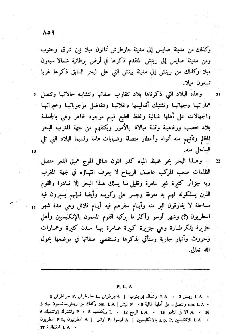 وهذا البحر بحر غليظ المياه كدر اللون هائل الموج عميق القعر متصل الظلمات صعب المركب عاصف الرياح لا يعرف انتهاؤه في جهة المغرب وبه جزائر كثيرة غير عامرة وقليل ما يسلك هذا البحر إلا نادرا والقوم الذين يسلكونه لهم به معرفة وجسر على ركوبه وأيضا فإنهم يسيرون فيه مساحلة لا يفارقون البر منه وأيام سفرهم فيه أيام قلائل وهي مدة شهر اسطريون (؟) وشهر أوسو وأكثر ما يركبه القوم المسمون بالإنكليسيين وأهل جزيرة إنكرطارة وهي جزيرة كبيرة عامرة بها مدن كثيرة وعمارات وحروث وأنهار جارية وسنأتي بذكرها ونستقصي صفاتها في موضعها بحول الله تعالى.