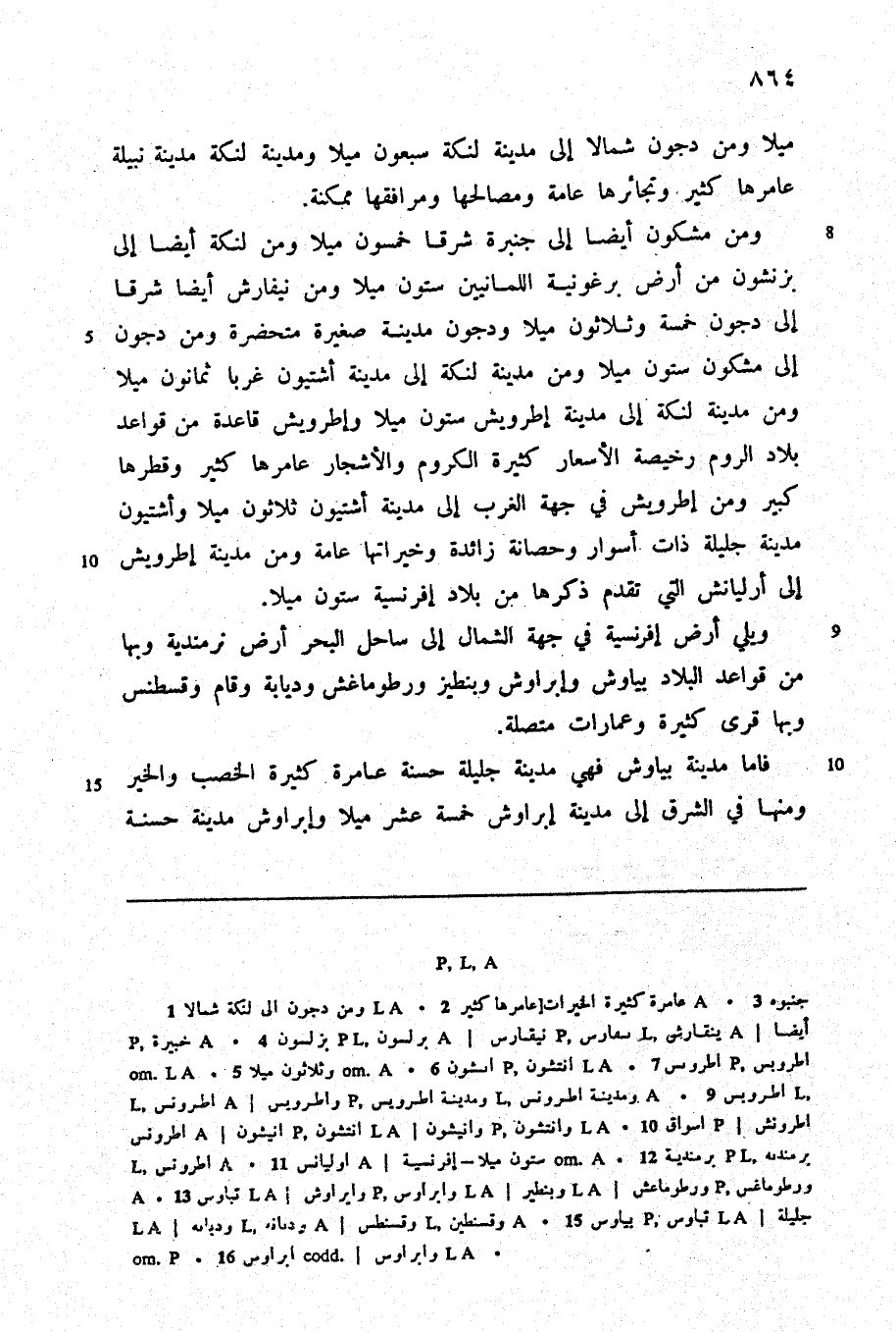 ومن مشكون أيضا إلى جنبرة شرقا خمسون ميلا ومن لنكة أيضا إلى بزنشون من أرض برغونية اللمانيين ستون ميلا ومن نيفارش أيضا شرقا إلى دجون خمسة وثلاثون ميلا ودجون مدينة صغيرة متحضرة ومن دجون إلى مشكون ستون ميلا ومن مدينة لنكة إلى مدينة أشتيون غربا ثمانون ميلا ومن مدينة لنكة إلى مدينة إطرويش ستون ميلا وإطرويش قاعدة من قواعد بلاد الروم رخيصة الأسعار كثيرة الكروم والأشجار عامرها كثير وقطرها كبير ومن إطرويش في جهة الغرب إلى مدينة أشتيون ثلاثون ميلا وأشتيون مدينة جليلة ذات أسوار وحصانة زائدة وخيراتها عامة ومن مدينة إطرويش إلى أرليانش التي تقدم ذكرها من بلاد إفرنسية ستون ميلا.