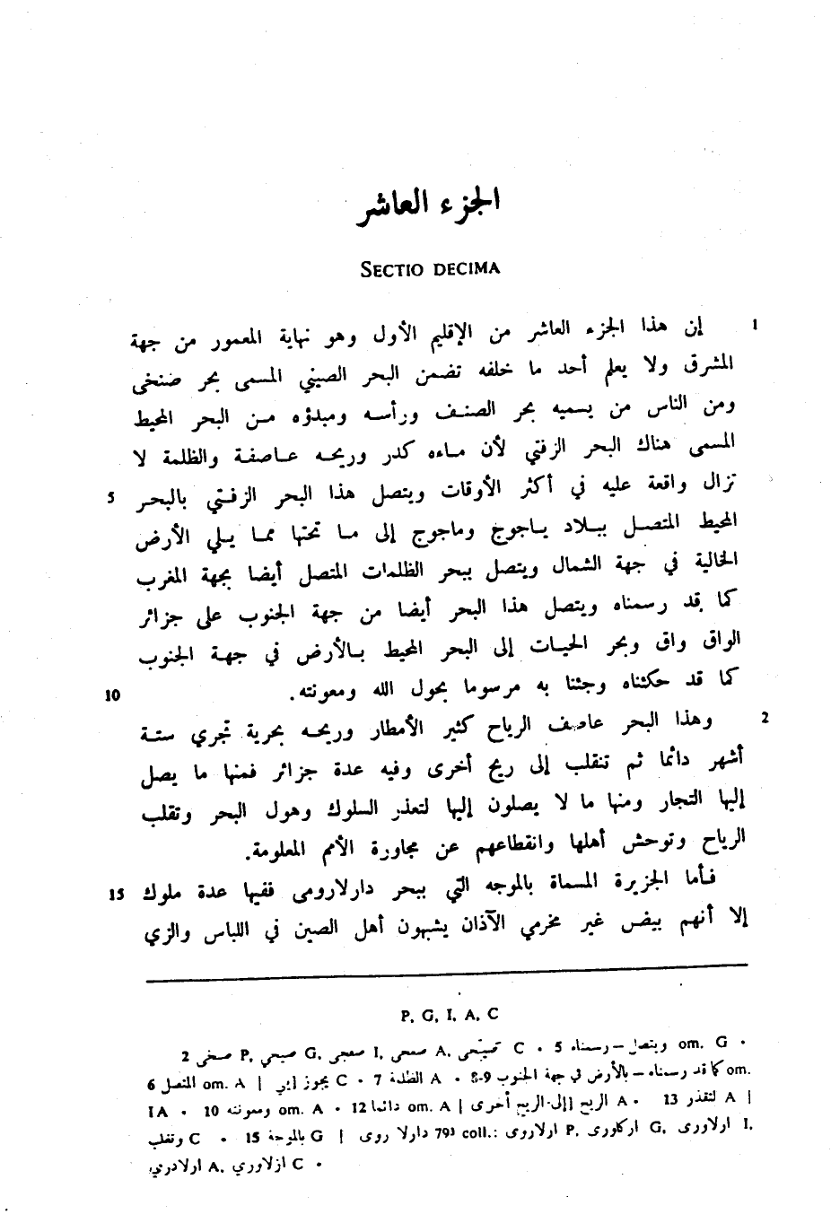 إن هذا الجزء العاشر من الإقليم الأول وهو نهاية المعمور من جهة المشرق ولا يعلم أحد ما خلفه تضمن البحر الصيني المسمى بحر صنخى ومن الناس من يسميه بحر الصنف ورأسه ومبدؤه من البحر المحيط المسمى هناك البحر الزفتي لأن ماءه كدر وريحه عاصفة والظلمة لا تزال واقعة عليه في أكثر الأوقات ويتصل هذا البحر الزفتي بالبحر المحيط المتصل ببلاد ياجوج وماجوج إلى ما تحتها مما يلي الأرض الخالية في جهة الشمال ويتصل ببحر الظلمات المتصل أيضا بجهة المغرب كما قد رسمناه ويتصل هذا البحر أيضا من جهة الجنوب على جزائر الواق واق وبحر الحيات إلى البحر المحيط بالأرض في جهة الجنوب كما قد حكيناه وجئنا به مرسوما بحول الله ومعونته.