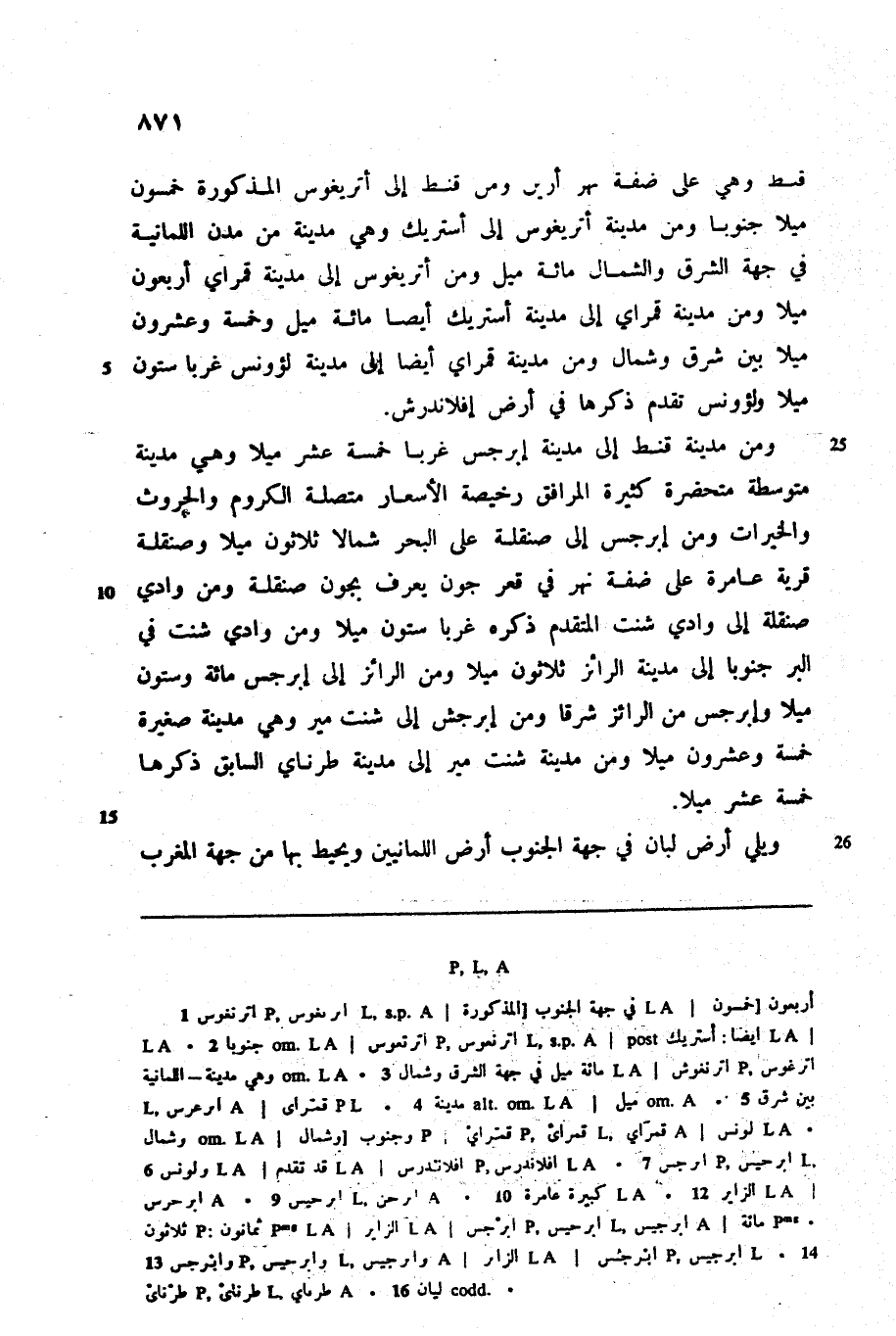 قنط وهي على ضفة نهر أرين ومن قنط إلى أتريغوس المذكورة خمسون ميلا جنوبا ومن مدينة أتريغوس إلى أستريك وهي مدينة من مدن اللمانية في جهة الشرق والشمال مائة ميل ومن أتريغوس إلى مدينة قمراي أربعون ميلا ومن مدينة قمراي إلى مدينة أستريك أيصا مائة ميل وخمسة وعشرون ميلا بين شرق وشمال ومن مدينة قمراي أيضا إلى مدينة لؤونس غربا ستون ميلا ولؤونس تقدم ذكرها في أرض إفلاندرش.