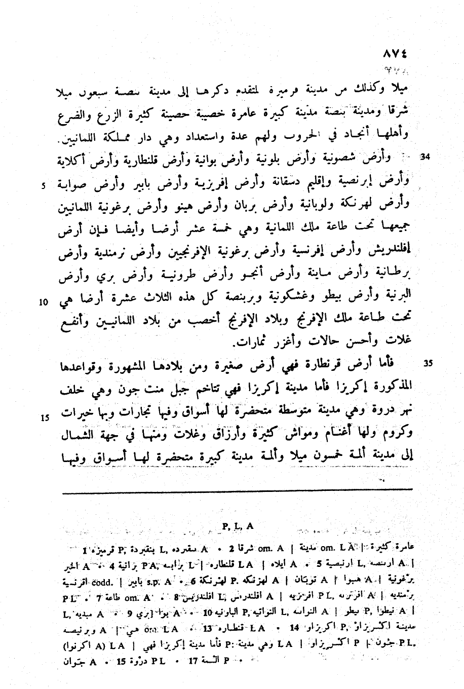 وأرض شصونية وأرض بلونية وأرض بوانية وأرض قلنطارية وأرض أكلاية وأرض إبرنصية وإقليم دسقانة وأرض إفريزية وأرض بابير وأرض صوابة وأرض لهرنكة ولوبانية وأرض بربان وأرض هينو وأرض برغونية اللمانيين جميعها تحت طاعة ملك اللمانية وهي خمسة عشر أرضا وأيضا فإن أرض إفلندريش وأرض إفرنسية وأرض برغونية الإفرنجيين وأرض نرمندية وأرض برطانية وأرض ماينة وأرض أنجو وأرض طرونية وأرض بري وأرض البرنية وأرض بيطو وغشكونية وبربنصة كل هذه الثلاث عشرة أرضا هي تحت طاعة ملك الإفرنج وبلاد الإفرنج أخصب من بلاد اللمانيين وأنفع غلات وأحسن حالات وأغزر ثمارات.