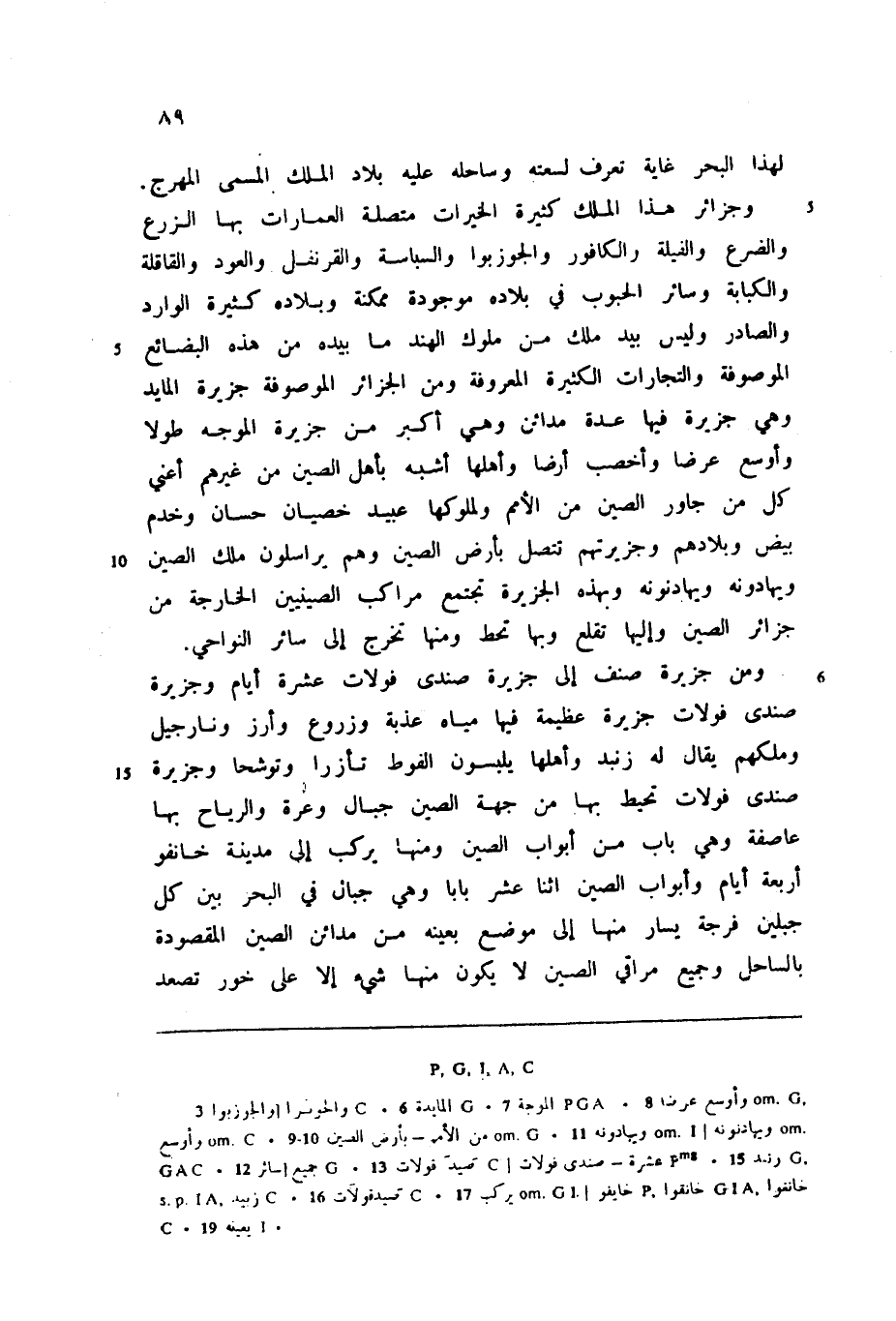 وجزائر هذا الملك كثيرة الخيرات متصلة العمارات بها الزرع والضرع والفيلة والكافور والجوزبوا والسباسة والقرنفل والعود والقاقلة والكبابة وسائر الحبوب في بلاده موجودة ممكنة وبلاده كثيرة الوارد والصادر وليس بيد ملك من ملوك الهند ما بيده من هذه البضائع الموصوفة والتجارات الكثيرة المعروفة ومن الجزائر الموصوفة جزيرة المايد وهي جزيرة فيها عدة مدائن وهي أكبر من جزيرة الموجه طولا وأوسع عرضا وأخصب أرضا وأهلها أشبه بأهل الصين من غيرهم أعني كل من جاور الصين من الأمم ولملوكها عبيد خصيان حسان وخدم بيض وبلادهم وجزيرتهم تتصل بأرض الصين وهم يراسلون ملك الصين ويهادونه ويهادنونه وبهذه الجزيرة تجتمع مراكب الصينيين الخارجة من جزائر الصين وإليها تقلع وبها تحط ومنها تخرج إلى سائر النواحي.