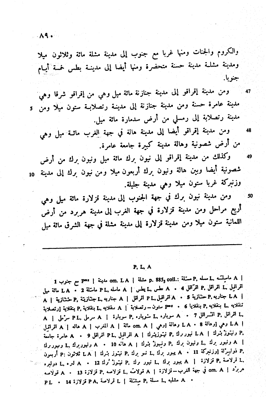 والكروم والجنات ومنها غربا مع جنوب إلى مدينة مشلة مائة وثلاثون ميلا ومدينة مشلة مدينة حسنة متحضرة ومنها أيضا إلى مدينة بطس خمسة أيام جنوبا.