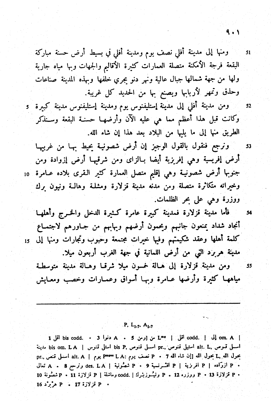 ومنها إلى مدينة أفلي نصف يوم ومدينة أفلي في بسيط أرض حسنة مباركة البقعة فرجة الأمكنة متصلة العمارات كثيرة الأقاليم والجهات وبها مياه جارية ولها من جهة شمالها جبال عالية ونهر دنو يجري خلفها وبهذه المدينة صناعات وحذق وتمهر لأربابها ويصنع بها من الحديد كل غريبة.