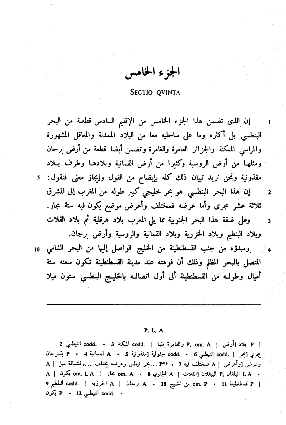 إن الذي تضمن هذا الجزء الخامس من الإقليم السادس قطعة من البحر البنطسي بل أكثره وما على ساحليه معا من البلاد الممدنة والمعاقل المشهورة والمراسي الممكنة والجزائر العامرة والغامرة وتضمن أيضا قطعة من أرض برجان ومثلها من أرض الروسية وكثيرا من أرض القمانية وبلادها وطرف بلاد مقذونية ونحن نريد تبيان ذلك كله بإيضاح من القول وإيجاز معنى فنقول: