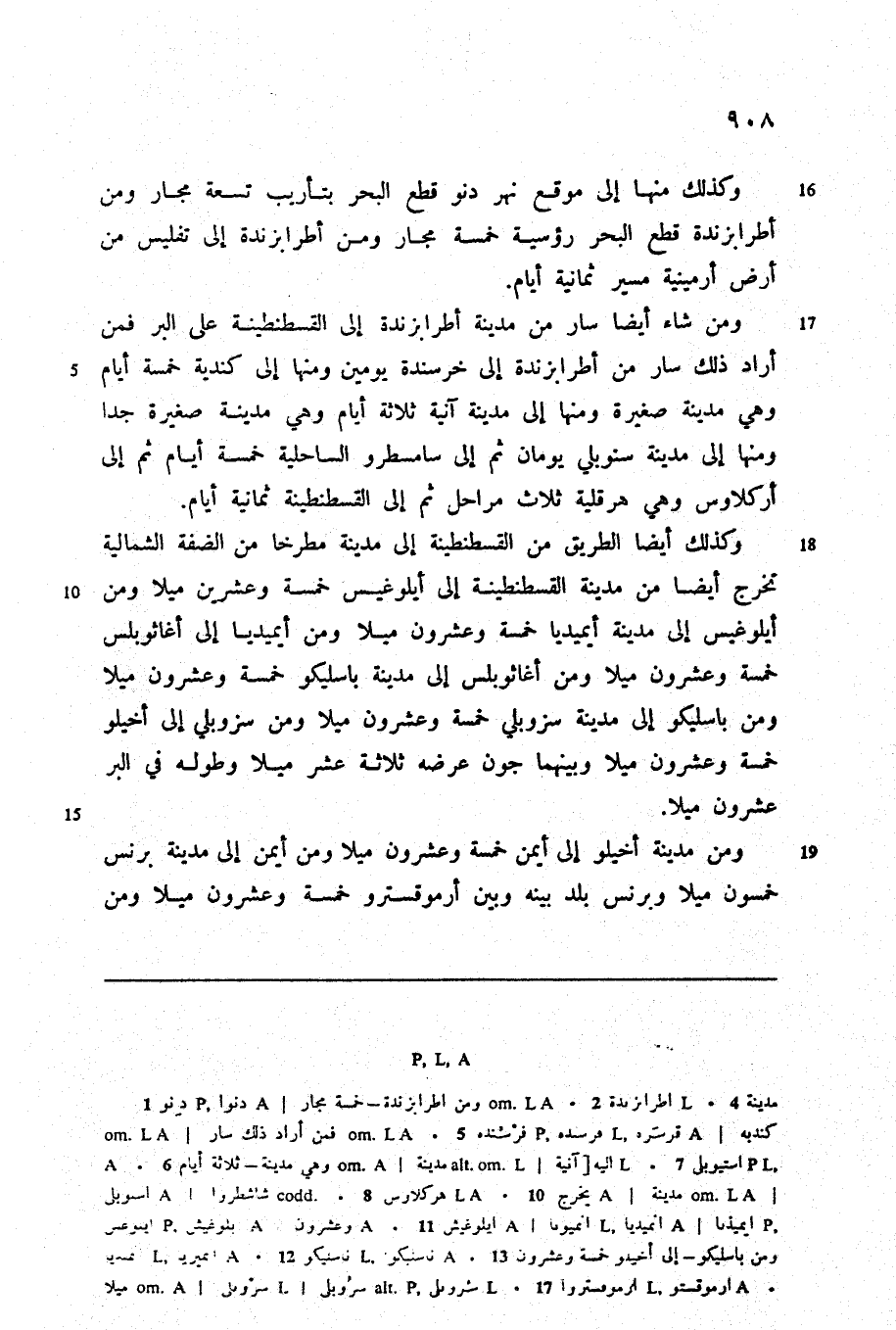 وكذلك منها إلى موقع نهر دنو قطع البحر بتأريب تسعة مجار ومن أطرابزندة قطع البحر رؤسية خمسة مجار ومن أطرابزندة إلى تفليس من أرض أرمينية مسير ثمانية أيام.