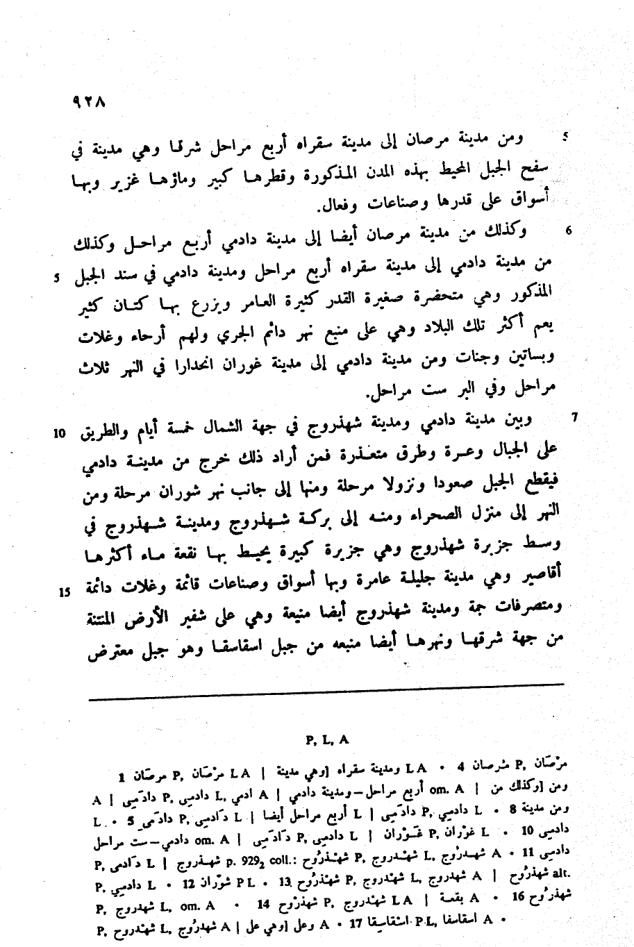 وكذلك من مدينة مرصان أيضا إلى مدينة دادمي أربع مراحل وكذلك من مدينة دادمي إلى مدينة سقراه أربع مراحل ومدينة دادمي في سند الجبل المذكور وهي متحضرة صغيرة القدر كثيرة العامر ويزرع بها كتان كثير يعم أكثر تلك البلاد وهي على منبع نهر دائم الجري ولهم أرحاء وغلات وبساتين وجنات ومن مدينة دادمي إلى مدينة غوران انحدارا في النهر ثلاث مراحل وفي البر ست مراحل.