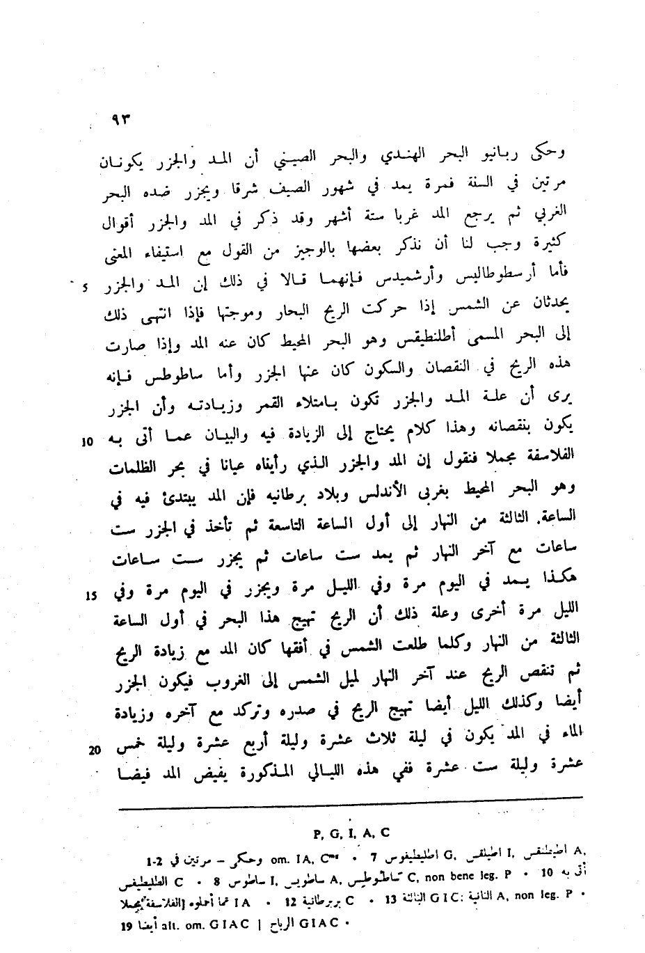 وحكى ربانيو البحر الهندي والبحر الصيني أن المد والجزر يكونان مرتين في السنة فمرة يمد في شهور الصيف شرقا ويجزر ضده البحر الغربي ثم يرجع المد غربا ستة أشهر وقد ذكر في المد والجزر أقوال كثيرة وجب لنا أن نذكر بعضها بالوجيز من القول مع استيفاء المعنى فأما أرسطوطاليس وأرشميدس فإنهما قالا في ذلك إن المد والجزر يحدثان عن الشمس إذا حركت الريح البحار وموجتها فإذا انتهى ذلك إلى البحر المسمى أطلنطيقس وهو البحر المحيط كان عنه المد وإذا صارت هذه الريح في النقصان والسكون كان عنها الجزر وأما ساطوطس فإنه يرى أن علة المد والجزر تكون بامتلاء القمر وزيادته وأن الجزر يكون بنقصانه وهذا كلام يحتاج إلى الزيادة فيه والبيان عما أتى به الفلاسفة مجملا فنقول إن المد والجزر الذي رأيناه عيانا في بحر الظلمات وهو البحر المحيط بغربى الأندلس وبلاد برطانيه فإن المد يبتدئ فيه في الساعة الثالثة من النهار إلى أول الساعة التاسعة ثم تأخذ في الجزر ست ساعات مع آخر النهار ثم يمد ست ساعات ثم يجزر ست ساعات هكذا يمد في اليوم مرة وفي الليل مرة ويجزر في اليوم مرة وفي الليل مرة أخرى وعلة ذلك أن الريح تهيج هذا البحر في أول الساعة الثالثة من النهار وكلما طلعت الشمس في أفقها كان المد مع زيادة الريح ثم تنقص الريح عند آخر النهار لميل الشمس إلى الغروب فيكون الجزر أيضا وكذلك الليل أيضا تهيج الريح في صدره وتركد مع آخره وزيادة الماء في المد يكون في ليلة ثلاث عشرة وليلة أربع عشرة وليلة خمس عشرة وليلة ست عشرة ففي هذه الليالي المذكورة يفيض المد فيضا