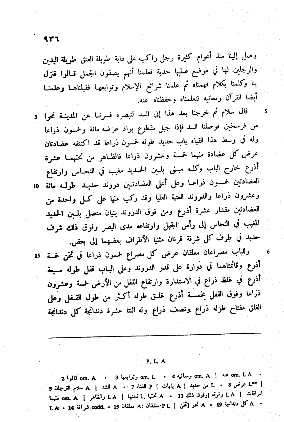 قال سلام ثم خرجنا بعد هذا إلى السد لنبصره فسرنا عن المدينة نحوا من فرسخين فوصلنا السد فإذا جبل مقطوع بواد عرضه مائة وخمسون ذراعا وله في وسط هذا القباء باب حديد طوله خمسون ذراعا قد اكتنفه عضادتان عرض كل عضادة منهما خمسة وعشرون ذراعا فالظاهر من تحتهما عشرة أذرع خارج الباب وكله مبنى بلبن الحديد مغيب في النحاس وارتفاع العضادتين خمسون ذراعا وعلى أعلى العضادتين دروند حديد طوله مائة وعشرون ذراعا والدروند العتبة العليا وقد ركب منها على كل واحدة من العضادتين مقدار عشرة أذرع ومن فوق الدروند بنيان متصل بلبن الحديد المغيب في النحاس إلى رأس الجبل وارتفاعه مدى البصر وفوق ذلك شرف حديد في طرف كل شرفة قرنان مثنيا الأطراف بعضهما إلى بعض.