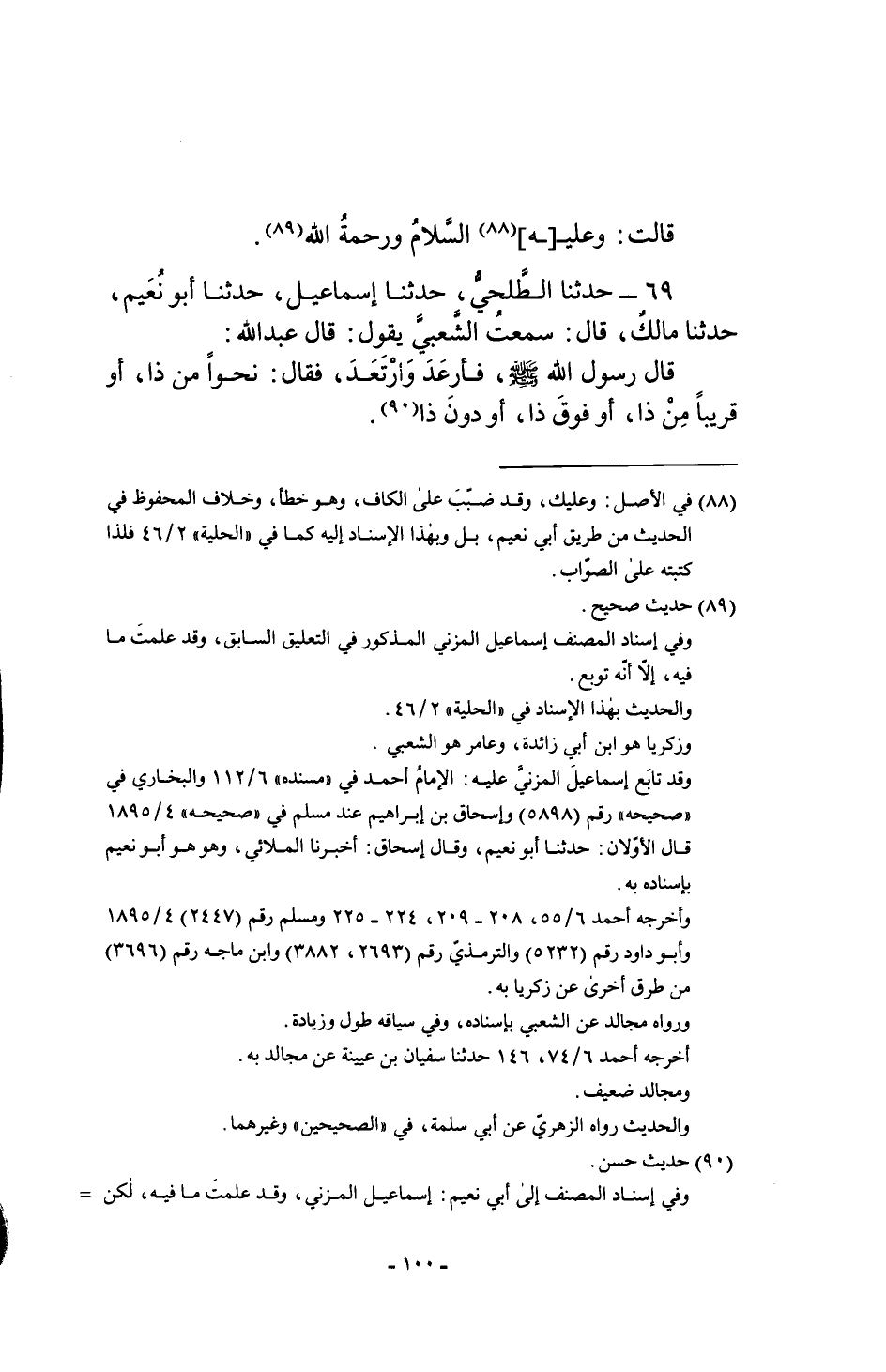 69 - حَدَّثَنَا الطَّلْحِيُّ، حَدَّثَنَا إِسْمَاعِيلٌ، حَدَّثَنَا أَبُو نُعَيْمٍ، حَدَّثَنَا مَالِكٌ، قَالَ: سَمِعْتُ الشَّعْبِيَّ، يَقُولُ: قَالَ عَبْدُ اللَّهِ: " قَالَ رَسُولُ اللَّهِ صَلَّى اللهُ عَلَيْهِ وَسَلَّمَ، §فَأَرْعَدَ وَارْتَعَدَ، فَقَالَ: نَحْوًا مِنْ ذَا، أَوْ قَرِيبًا مِنْ ذَا، أَوْ فَوْقَ ذَا، أَوْ دُونَ ذَا "