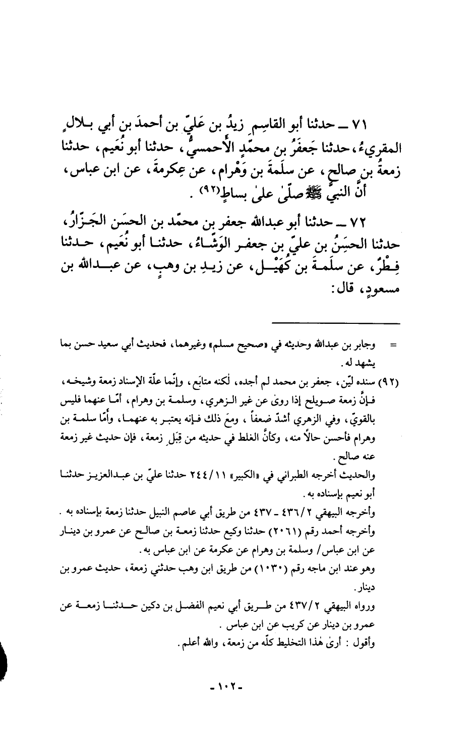 71 - حَدَّثَنَا أَبُو الْقَاسِمِ زَيْدُ بْنُ عَلِيِّ بْنِ أَحْمَدَ بْنِ أَبِي بِلَالٍ الْمُقْرِئُ، حَدَّثَنَا جَعْفَرُ بْنُ مُحَمَّدٍ الْأَحْمَسِيُّ، حَدَّثَنَا أَبُو نُعَيْمٍ، حَدَّثَنَا زَمْعَةُ بْنُ صَالِحٍ، عَنْ سَلَمَةَ بْنِ وَهْرَامَ، عَنْ عِكْرِمَةَ، عَنِ ابْنِ عَبَّاسٍ، أَنَّ النَّبِيَّ صَلَّى اللهُ عَلَيْهِ وَسَلَّمَ §صَلَّى عَلَى بِسَاطٍ "