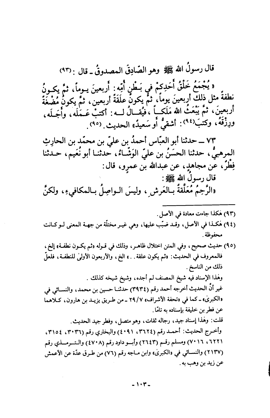 73 - حَدَّثَنَا أَبُو الْعَبَّاسِ أَحْمَدُ بْنُ عَلِيِّ بْنِ مُحَمَّدِ بْنِ الْحَارِثِ الْمُرْهِبِيُّ، حَدَّثَنَا الْحَسَنُ بْنُ عَلِيٍّ الْوَشَّاءُ، حَدَّثَنَا أَبُو نُعَيْمٍ، حَدَّثَنَا فِطْرٌ، عَنْ مُجَاهِدٍ، عَنْ عَبْدِ اللَّهِ بْنِ عَمْرٍو، قَالَ: قَالَ رَسُولُ اللَّهِ صَلَّى اللهُ عَلَيْهِ وَسَلَّمَ: «§الرَّحِمُ مُعَلَّقَةٌ بِالْعَرْشِ، وَلَيْسَ الْوَاصِلُ بِالْمُكَافِئِ، وَلَكِنَّ -[104]- الْوَاصِلَ إِذَا قُطِعَتْ رَحِمُهُ وَصَلَهَا»