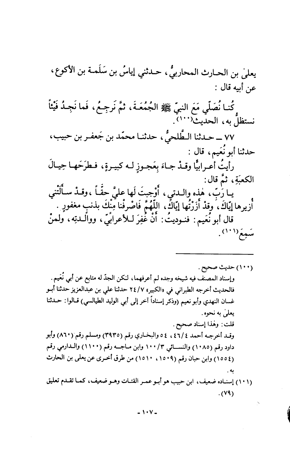 77 - حَدَّثَنَا الطَّلْحِيُّ، حَدَّثَنَا مُحَمَّدُ بْنُ جَعْفَرِ بْنِ حَبِيبٍ، حَدَّثَنَا أَبُو نُعَيْمٍ، قَالَ: " رَأَيْتُ أَعْرَابِيًّا وَقَدْ جَاءَ بِعَجُوزٍ لَهُ كَبِيرَةٍ، فَطَرَحَهَا حِيَالَ الْكَعْبَةِ، ثُمَّ قَالَ: §يَا رَبِّ، هَذِهِ وَالِدَتِي، أَوْجَبْتَ لَهَا عَلِيَّ حَقًّا، وَقَدْ سَأَلْتَنِي أُزِيرُهَا إِيَّاكَ، وَقَدْ أَزَرْتُهَا إِيَّاكَ، اللَّهُمَّ فَاصْرِفْنَا مِنْكَ بِذَنْبٍ مَغْفُورٍ " قَالَ أَبُو نُعَيْمٍ: فَنُودِيتُ: أَنْ غُفِرَ لِلْأَعْرَابِيِّ، وَوَالِدَتِهِ، وَلِمَنْ سَمِعَ