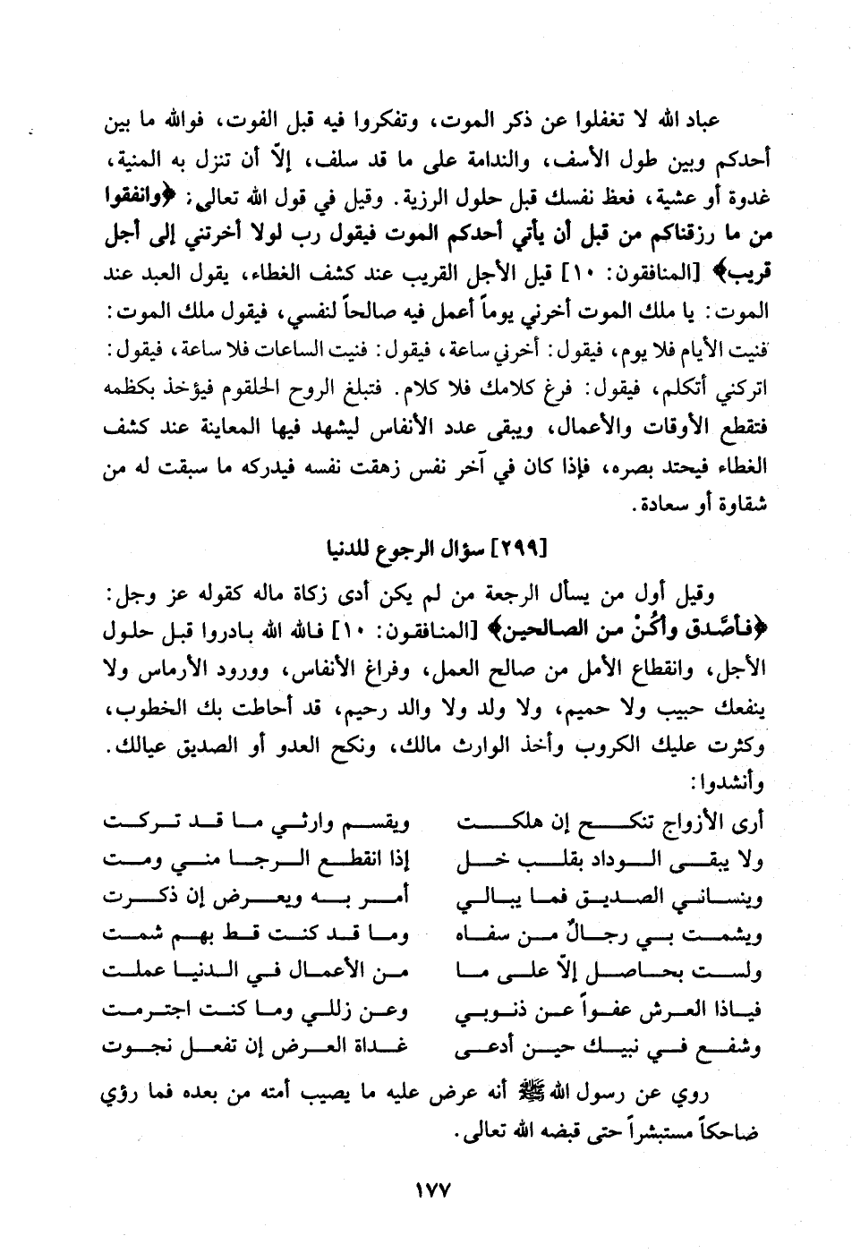 وَقيل أول من يسْأَل الرّجْعَة من لم يكن أدّى زَكَاة مَاله كَقَوْلِه عز وَجل {فَأَصدق وأكن من الصَّالِحين} المُنَافِقُونَ 10 فَالله الله بَادرُوا قبل حُلُول الْأَجَل وَانْقِطَاع الأمل من صَالح الْعَمَل وفراغ الأنفاس وورود الأرماس وَلَا ينفعك حبيب وَلَا حميم وَلَا ولد وَلَا وَالِد رَحِيم قد أحاطت بك الخطوب وَكَثُرت عَلَيْك الكروب وَأخذ الْوَارِث مَالك ونكح الْعَدو أَو الصّديق عِيَالك