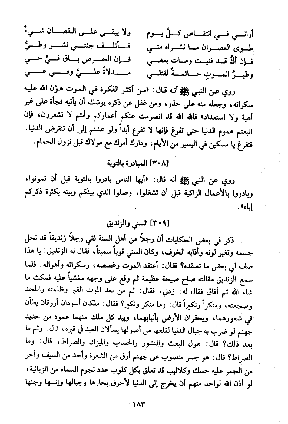 فَلَمَّا سمع الزنديق مقَالَته صَاح صَيْحَة عَظِيمَة ثمَّ وَقع على وَجهه مغشيا عَلَيْهِ فَمَكثَ مَا شَاءَ الله ثمَّ أَفَاق فَقَالَ لَهُ زِدْنِي فَقَالَ ثمَّ من بعد الْمَوْت الْقَبْر وظلمته واللحد وضجعته ومنكرا ونكيرا قَالَ وَمَا مُنكر وَنَكِير فَقَالَ ملكان أسودان أزرقان يطآن فِي شعورهما ويحفران الأَرْض بأنيابهما وبيد كل ملك مِنْهُمَا عَمُود من حَدِيد جَهَنَّم لَو ضرب بِهِ جبال الدُّنْيَا لقلعها من أُصُولهَا يسألان العَبْد فِي قَبره قَالَ وَثمّ مَا بعد ذَلِك قَالَ هول الْبَعْث والنشور والحساب وَالْمِيزَان والصراط قَالَ وَمَا الصِّرَاط قَالَ هُوَ جسر مَنْصُوب على جَهَنَّم أرق من الشعرة وَأحد من السَّيْف وأحر من الْجَمْر عَلَيْهِ حسك وكلاليب قد تعلق بِكُل كَلوب عدد نُجُوم السَّمَاء من الزَّبَانِيَة لَو أذن الله لوَاحِد مِنْهُم أَن يخرج إِلَى الدُّنْيَا لاحرق بحارها وجبالها وإنسها وجنها