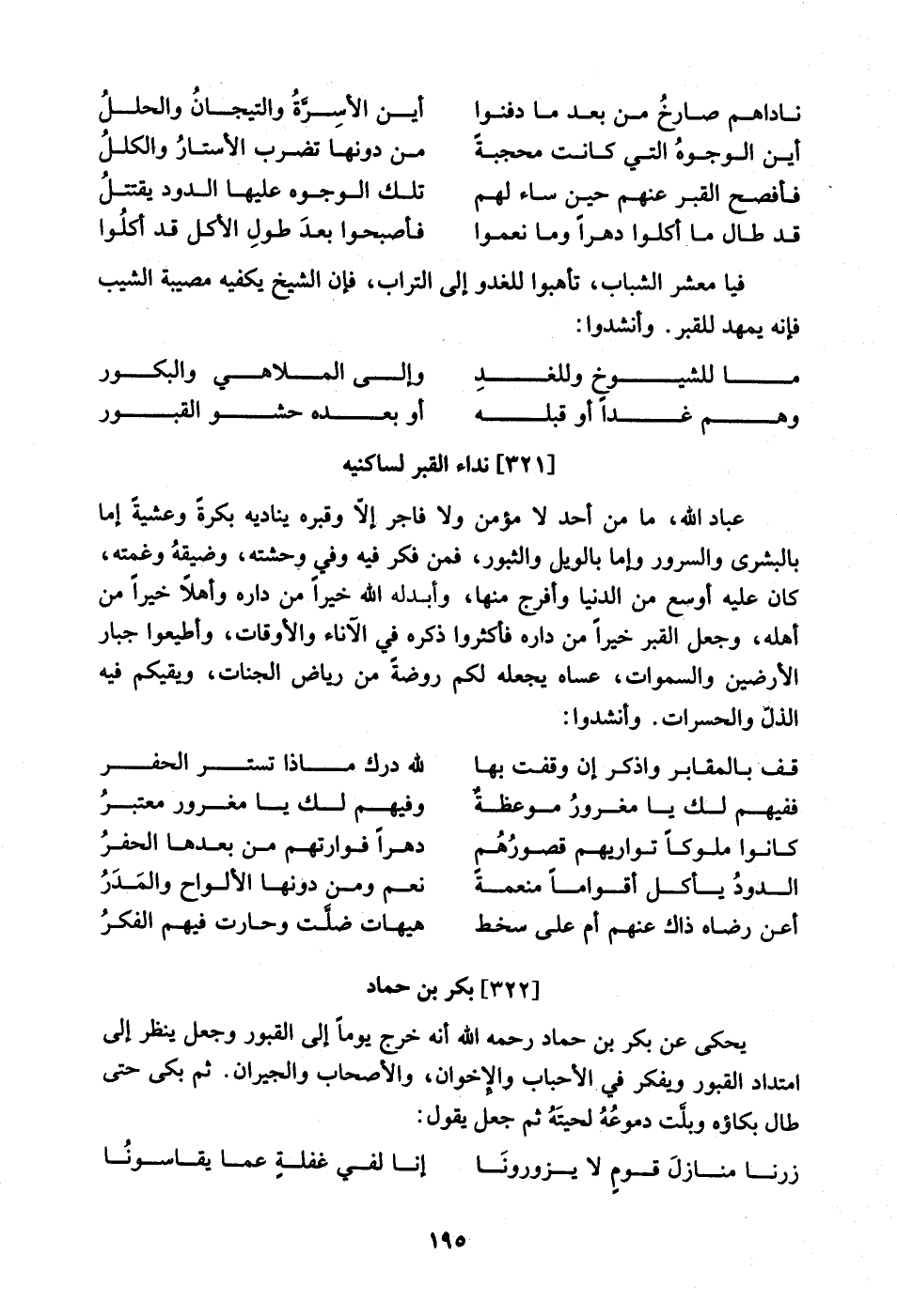 يحْكى عَن بكر بن حَمَّاد رَحمَه الله أَنه خرج يَوْمًا إِلَى الْقُبُور وَجعل ينظر إِلَى امتداد الْقُبُور ويفكر فِي الأحباب والإخوان وَالْأَصْحَاب وَالْجِيرَان