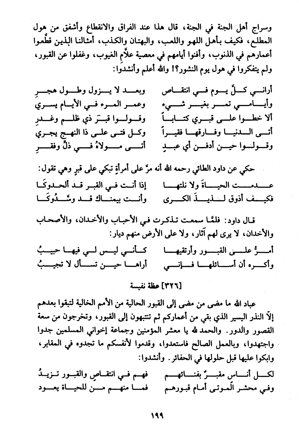 وسراج أهل الْجنَّة فِي الْجنَّة قَالَ هَذَا عِنْد الْفِرَاق والانقطاع وأشفق من هول المطلع فَكيف بِأَهْل اللَّهْو واللعب والبهتان وَالْكذب أمثالنا الَّذين قطعُوا أعمارهم فِي الذُّنُوب وأفنوا أيامهم فِي مَعْصِيّة علام الغيوب وغفلوا عَن الْقُبُور وَلم يتفكروا فِي هول يَوْم النشور وَالله أعلم وأنشدوا