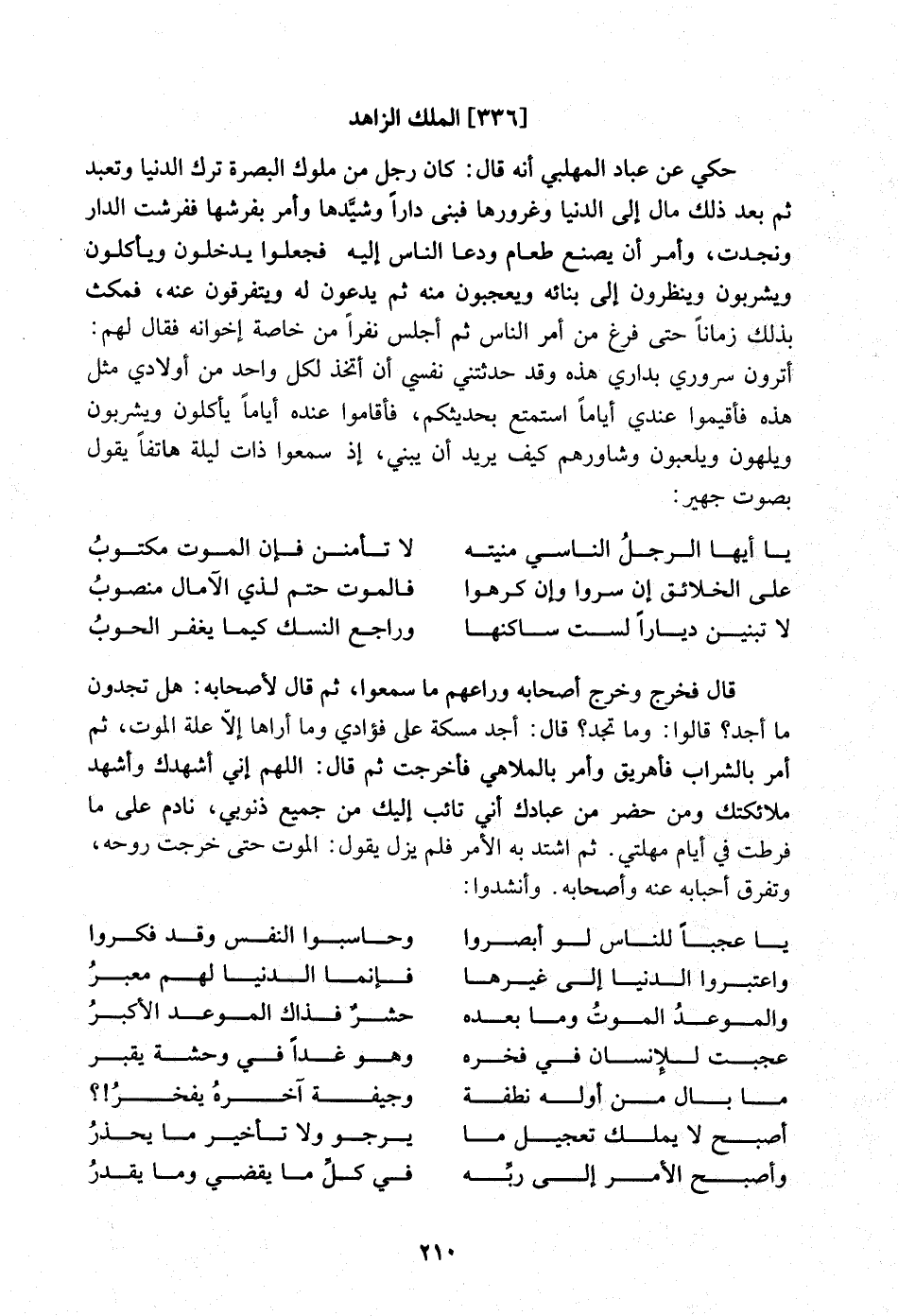 حُكيَ عَن عباد المهلبي أَنه قَالَ كَانَ رجل من مُلُوك الْبَصْرَة ترك الدُّنْيَا وَتعبد ثمَّ بعد ذَلِك مَال إِلَى الدُّنْيَا وغرورها فَبنى دَارا وشيدها وَأمر بفرشها ففرشت الدَّار ونجدت وَأمر أَن يصنع طَعَام ودعا النَّاس إِلَيْهِ فَجعلُوا يدْخلُونَ ويأكلون وَيَشْرَبُونَ وَيَنْظُرُونَ إِلَى بنائِهِ ويعجبون مِنْهُ ثمَّ يدعونَ لَهُ ويتفرقون عَنهُ فَمَكثَ بذلك زَمَانا حَتَّى فرغ من أَمر النَّاس ثمَّ أَجْلِس نَفرا من خَاصَّة إخوانه فَقَالَ لَهُم أَتَرَوْنَ سروري بداري هَذِه وَقد حَدَّثتنِي نَفسِي أَن أَتَّخِذ لكل وَاحِد من أَوْلَادِي مثل هَذِه فأقيموا عِنْدِي أَيَّامًا استمتع بحديثكم فأقاموا عِنْده أَيَّامًا يَأْكُلُون وَيَشْرَبُونَ ويلهون ويلعبون وشاورهم كَيفَ يُرِيد أَن يَبْنِي إِذْ سمعُوا ذَات لَيْلَة هاتفا يَقُول بِصَوْت جهير