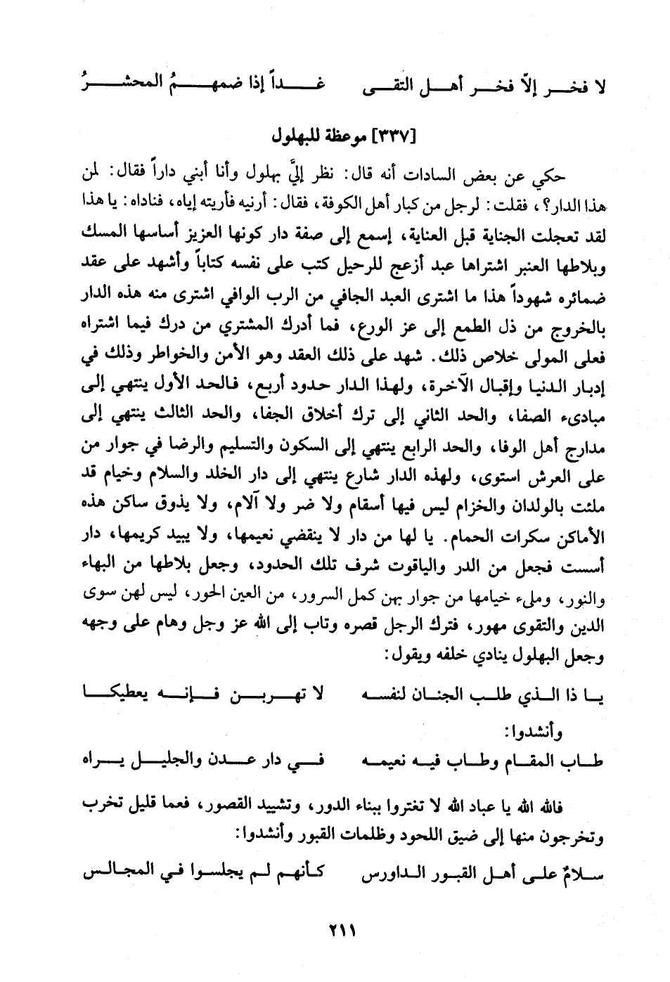 يَا لَهَا من دَار لَا يَنْقَضِي نعيمها وَلَا يبيد كريمها دَار أسست فَجعل من الدّرّ والياقوت شرف تِلْكَ الْحُدُود وَجعل بلاطها من الْبَهَاء والنور ومليء خيامها من جوَار بِهن كمل السرُور من الْعين الْحور لَيْسَ لَهُنَّ سوى الدّين وَالتَّقوى مُهُور فَترك الرجل قصره وَتَابَ إِلَى الله عز وَجل وهام على وَجهه وَجعل البهلول يُنَادي خَلفه وَيَقُول