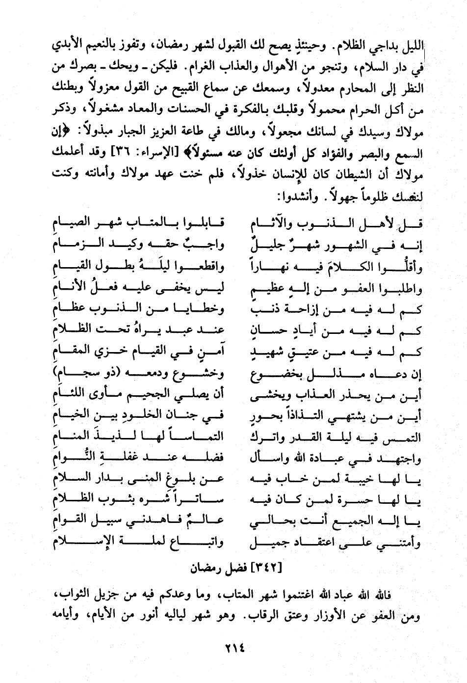 فَلْيَكُن وَيحك بَصرك من النّظر إِلَى الْمَحَارِم معدولا وسمعك عَن سَماع الْقَبِيح من القَوْل معزولا وبطنك من أكل الْحَرَام مَحْمُولا وقلبك بالفكرة فِي الْحَسَنَات والمعاد مَشْغُولًا وَذكر مَوْلَاك وسيدك فِي لسَانك مجعولا وَمَالك فِي طَاعَة الْعَزِيز الْجَبَّار مبذولا {إِن السّمع وَالْبَصَر والفؤاد كل أُولَئِكَ كَانَ عَنهُ مسؤولا} الْإِسْرَاء 36 وَقد أعلمك مَوْلَاك أَن الشَّيْطَان كَانَ للْإنْسَان خذولا فَلم خُنْت عهد مَوْلَاك وأمانته وَكنت لنَفسك ظلوما جهولا