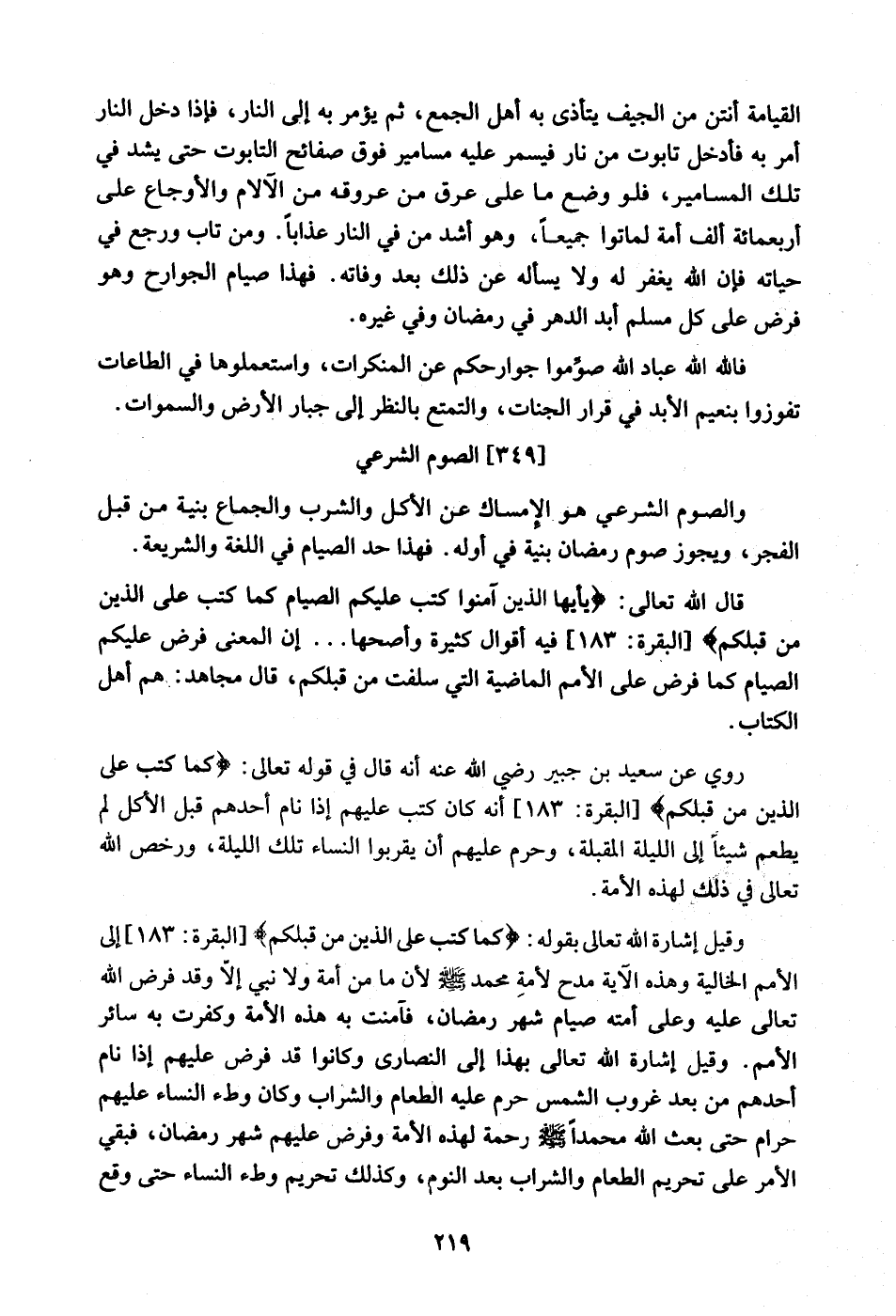 قَالَ الله تَعَالَى {يَا أَيهَا الَّذين آمنُوا كتب عَلَيْكُم الصّيام كَمَا كتب على الَّذين من قبلكُمْ} الْبَقَرَة 183 فِيهِ أَقْوَال كَثِيرَة وأصحها إِن الْمَعْنى فرض عَلَيْكُم الصّيام كَمَا فرض على الْأُمَم الْمَاضِيَة الَّتِي سلفت من قبلكُمْ قَالَ مُجَاهِد هم أهل الْكتاب