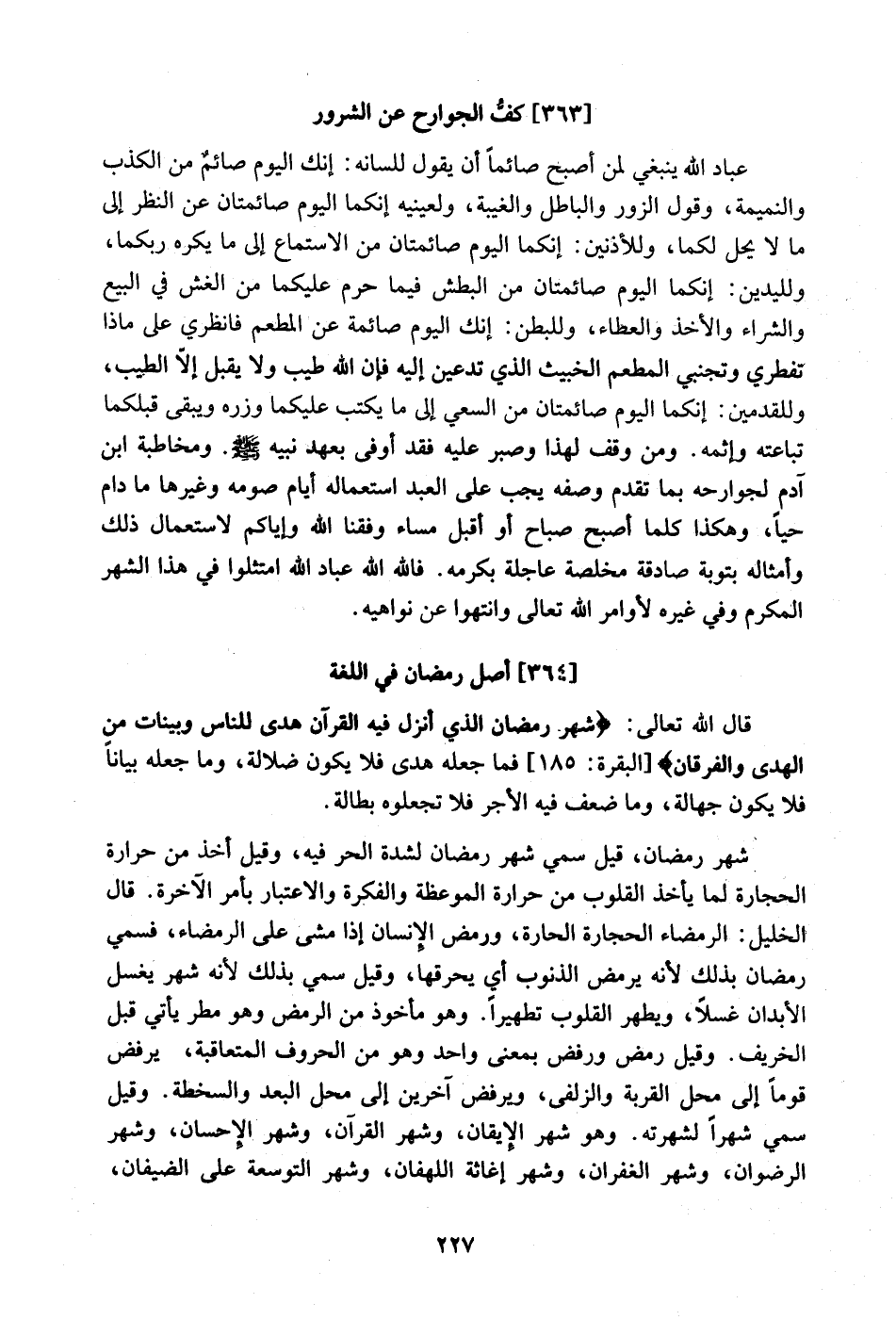 أترضى يَا مِسْكين أَن يرد صومك فِي وَجهك من غير قبُول من الله أتستحسن أَن تكون جائعا عطشان وَلَيْسَ لَك جاه عِنْد الله أَيْن النِّيَّة الْمُجَرَّدَة أَيْن التَّوْبَة المجددة أَيْن الندامة الْمُؤَكّدَة أَيْن الْحَلَال من الطَّعَام أَيْن اجْتِنَاب الطعمة الْحَرَام أَيْن حجر الأوزار والآثام أَيْن الرَّحْمَة لِذَوي الْفقر والضعفاء والأيتام أَيْن الْإِخْلَاص للْملك العلام أَيْن الْتِزَام شَرِيعَة الْإِسْلَام أَيْن الأسوة بِالنَّبِيِّ عَلَيْهِ الصَّلَاة وَالسَّلَام انْظُر يَا مِسْكين إِذا قطعت نهارك بالعطش والجوع وأحييت ليلك بطول السُّجُود الرُّكُوع إِنَّك فِيمَا تظن صَائِم وَأَنت فِي جهالتك جازم وَفِي صَلَاتك دَائِم وَفِي بحار سكراتك هائم