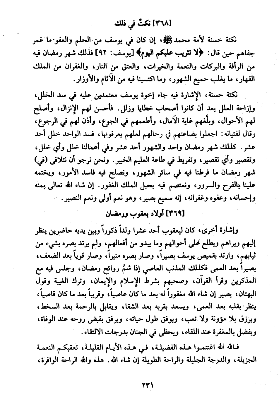 وَإِشَارَة أُخْرَى كَانَ ليعقوب أحد عشرا ولدا ذُكُورا وَبَين يَدَيْهِ حاضرين ينظر إِلَيْهِم ويراهم ويطلع على أَحْوَالهم وَمَا يبدوا من أفعالهم وَلم يرْتَد بَصَره بِشَيْء من ثِيَابهمْ وارتد بقميص يُوسُف بَصيرًا وَصَارَ بَصَره منيرا وَصَارَ قَوِيا بعد الضعْف بَصيرًا بعد الْعَمى فَكَذَلِك المذنب العَاصِي إِذا شم رَوَائِح رَمَضَان وَجلسَ فِيهِ مَعَ المذكرين وَقَرَأَ الْقُرْآن وصحبهم بِشَرْط الْإِسْلَام وَالْإِيمَان وَترك الْغَيْبَة وَقَول الْبُهْتَان يصير إِن شَاءَ الله مغفورا لَهُ بعد مَا كَانَ عَاصِيا وقريبا بعد مَا كَانَ قاصيا ينظر بِقَلْبِه بعد الْعَمى ويسعد بِقُرْبِهِ بعد الشقا ويقابل بِالرَّحْمَةِ بعد السخط ويرزق بِلَا مؤونة وَلَا تَعب ويوفق طول حَيَاته ويرفق بِقَبض روحه عِنْد الْوَفَاة ويفضل بالمغفرة عِنْد اللِّقَاء ويحظى فِي الْجنان بدرجات الالتقاء