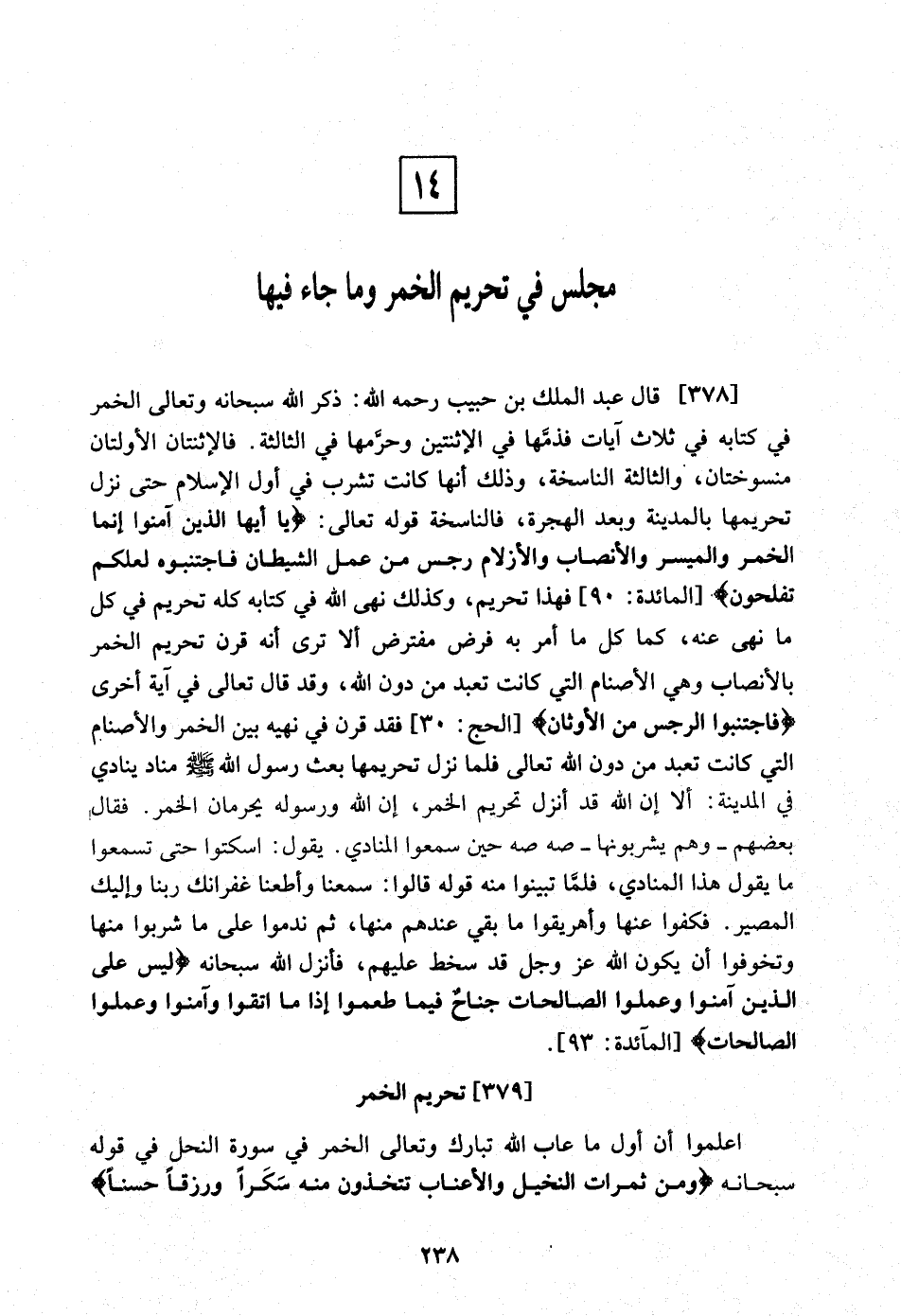 378 - قَالَ عبد الْملك بن حبيب رَحمَه الله ذكر الله سُبْحَانَهُ وَتَعَالَى الْخمر فِي كِتَابه فِي ثَلَاث آيَات فذمها فِي الإثنتين وحرمها فِي الثَّالِثَة