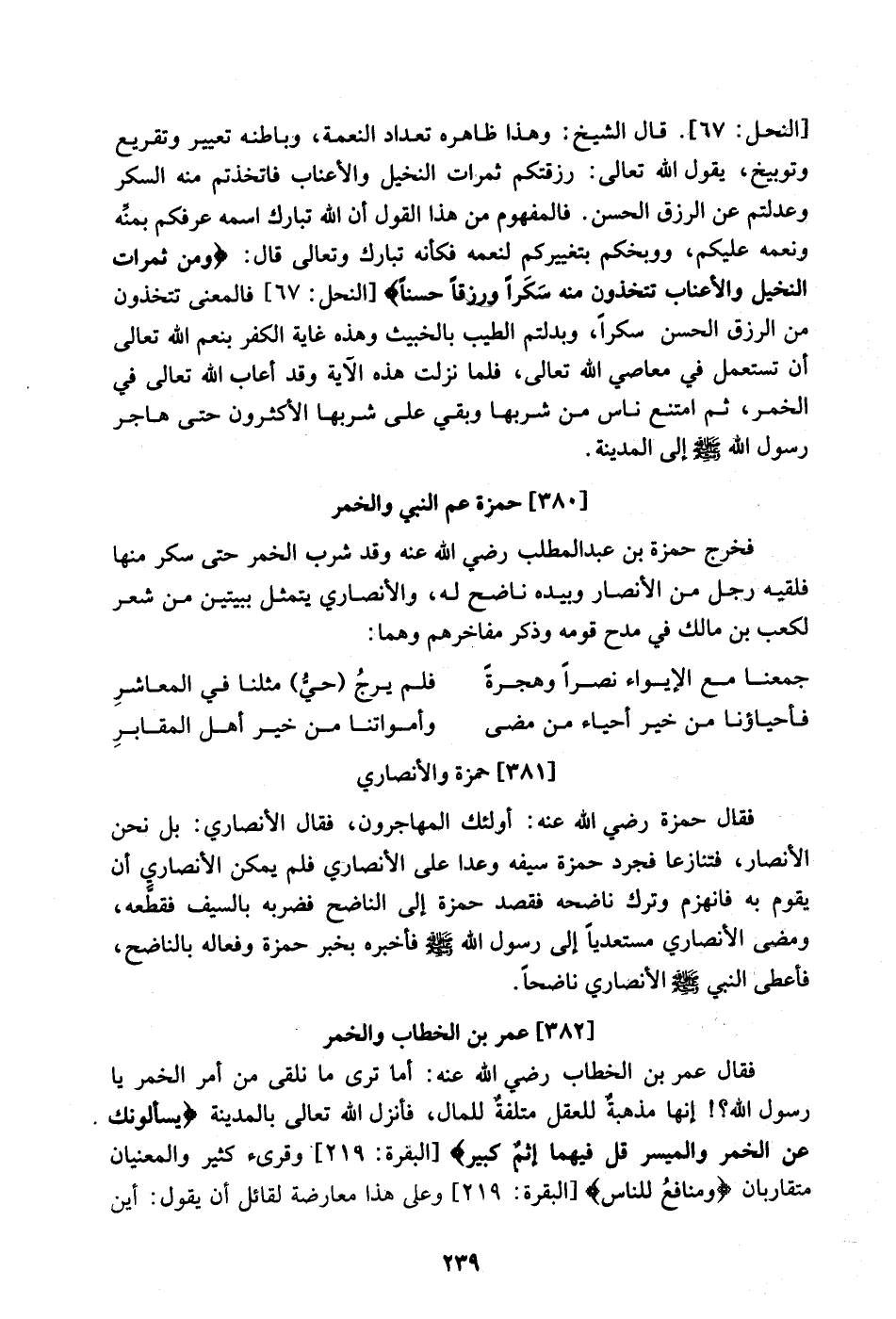 فَخرج حَمْزَة بن عبد الْمطلب رَضِي الله عَنهُ وَقد شرب الْخمر حَتَّى سكر مِنْهَا فَلَقِيَهُ رجل من الْأَنْصَار وَبِيَدِهِ نَاضِح لَهُ والأنصاري يتَمَثَّل ببيتين من شعر لكعب بن مَالك فِي مدح قومه وَذكر مفاخرهم وهما