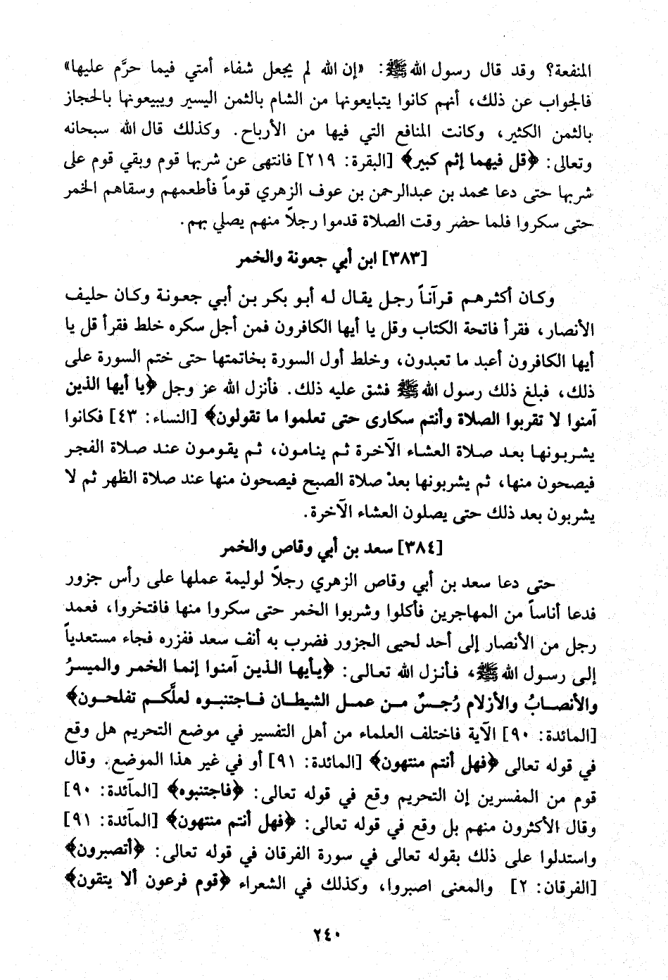 وَكَذَلِكَ قَالَ الله سُبْحَانَهُ وَتَعَالَى {قل فيهمَا إِثْم كَبِير} الْبَقَرَة 219 فَانْتهى عَن شربهَا قوم وَبَقِي قوم على شربهَا حَتَّى دَعَا مُحَمَّد بن عبد الرَّحْمَن بن عَوْف الزُّهْرِيّ قوما فأطعمهم وسقاهم الْخمر حَتَّى سَكِرُوا فَلَمَّا حضر وَقت الصَّلَاة قدمُوا رجلا مِنْهُم يُصَلِّي بهم