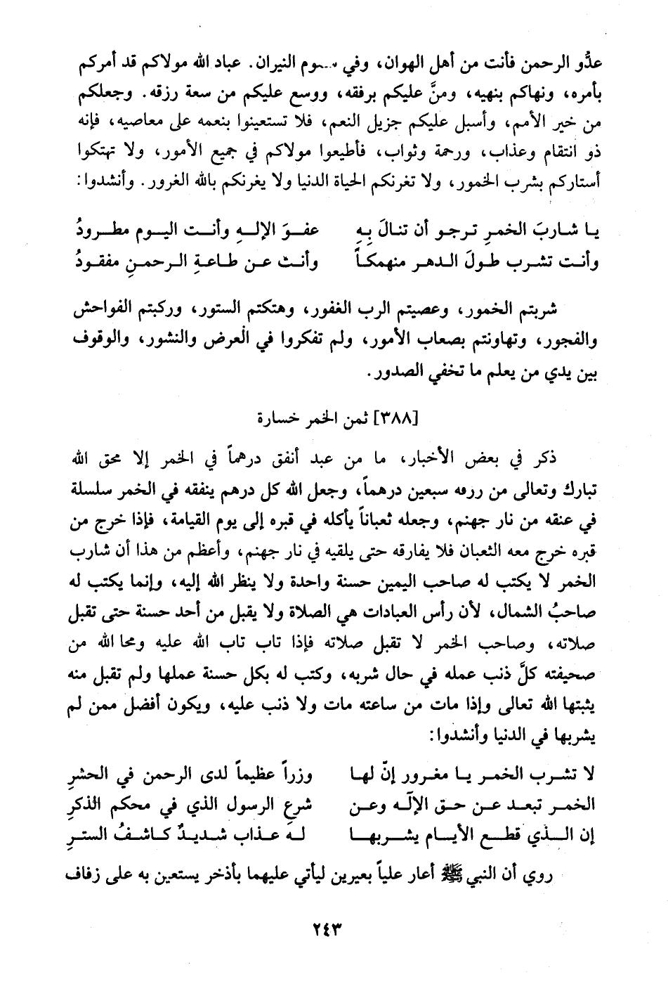 (لَا تشرب الْخمر يَا مغرور إِن لَهَا ... وزرا عَظِيما لَدَى الرَّحْمَن فِي الْحَشْر)