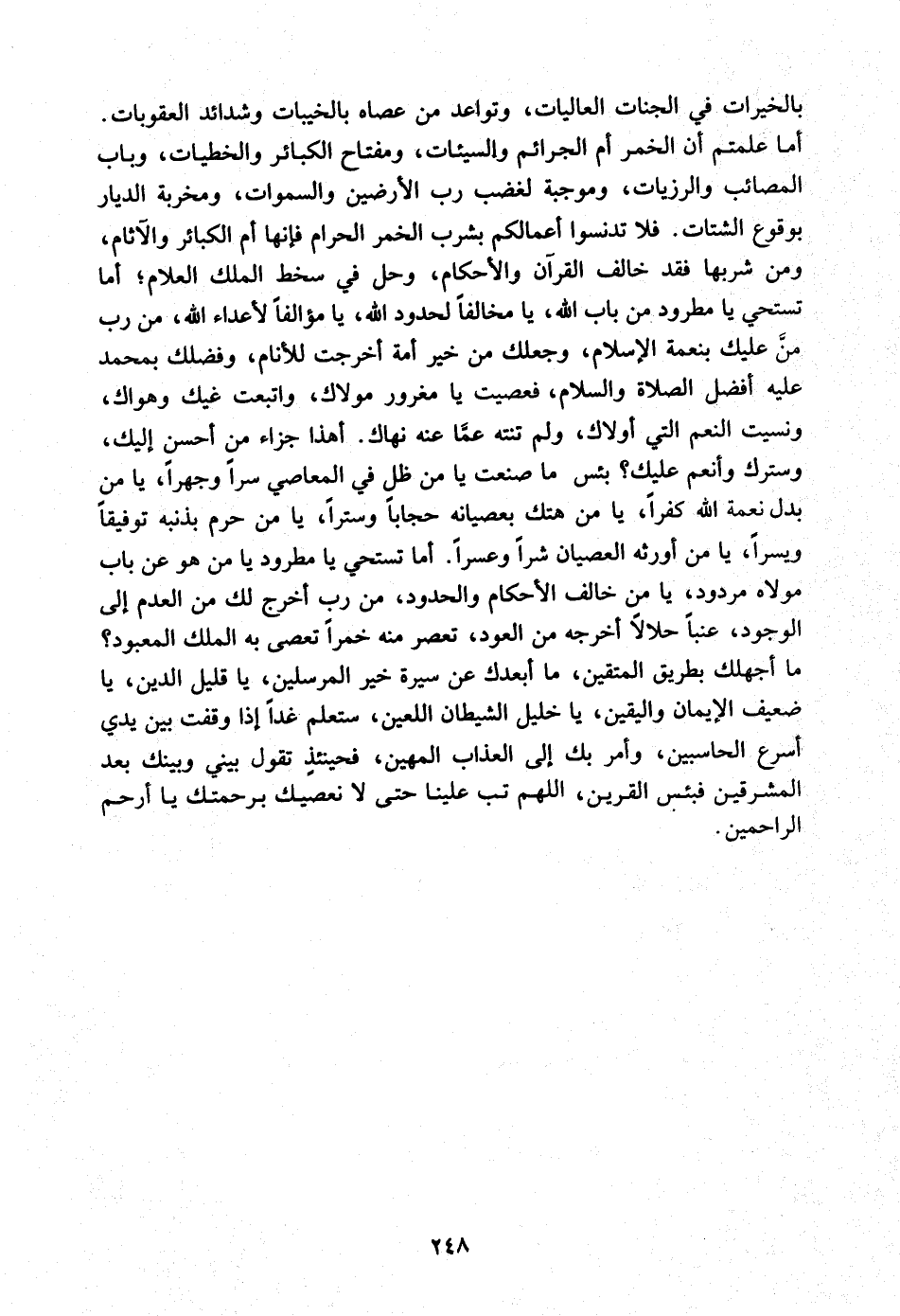 أما تَسْتَحي يَا مطرود يَا من هُوَ عَن بَاب مَوْلَاهُ مَرْدُود يَا من خَالف الْأَحْكَام وَالْحُدُود من رب أخرج لَك من الْعَدَم إِلَى الْوُجُود عنبا حَلَالا أخرجه من الْعود تعصر مِنْهُ خمرًا تَعْصِي بِهِ الْملك المعبود مَا أجهلك بطرِيق الْمُتَّقِينَ مَا أبعدك عَن سيرة خير الْمُرْسلين يَا قَلِيل الدّين يَا ضَعِيف الْإِيمَان وَالْيَقِين يَا خَلِيل الشَّيْطَان اللعين ستعلم غَدا إِذا وقفت بَين يَدي أسْرع الحاسبين وَأمر بك إِلَى الْعَذَاب المهين فَحِينَئِذٍ تَقول بيني وَبَيْنك بعد المشرقين فبئس القرين اللَّهُمَّ تب علينا حَتَّى لَا نَعْصِيك بِرَحْمَتك يَا أرْحم الرَّاحِمِينَ