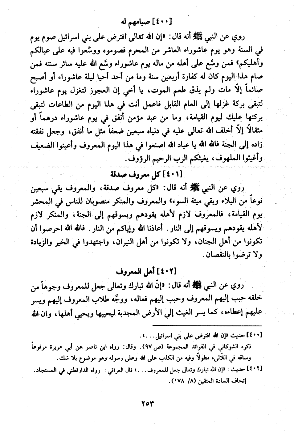 رُوِيَ عَن النَّبِي صلى الله عَلَيْهِ وَسلم أَنه قَالَ (إِن الله تَعَالَى افْترض على بني إِسْرَائِيل صَوْم يَوْم فِي السّنة وَهُوَ يَوْم عَاشُورَاء الْعَاشِر من الْمحرم فصوموه ووسعوا فِيهِ على عيالكم وأهليكم فَمن وسع على أَهله من مَاله يَوْم عَاشُورَاء وسع الله عَلَيْهِ سَائِر سنته فَمن صَامَ هَذَا الْيَوْم كَانَ لَهُ كَفَّارَة أَرْبَعِينَ سنة وَمَا من أحد أَحْيَا لَيْلَة عَاشُورَاء أَو اصبح صَائِما إِلَّا مَاتَ وَلم يذقْ طعم الْمَوْت يَا أخي إِن الْعَجُوز لتغزل يَوْم عَاشُورَاء لتبقي بركَة غزلها إِلَى الْعَام الْقَابِل فاعمل أَنْت فِي هَذَا الْيَوْم من الطَّاعَات لتبقي بركتها عَلَيْك إِلَى ليَوْم الْقِيَامَة وَمَا من عبد مُؤمن أنْفق فِي يَوْم عَاشُورَاء درهما أَو مِثْقَالا إِلَّا أخلف الله تَعَالَى عَلَيْهِ فِي دُنْيَاهُ سبعين ضعفا مثل مَا أنْفق وَجعل نَفَقَته زَاده إِلَى الْجنَّة فَالله الله يَا عباد الله اصنعوا فِي هَذَا الْيَوْم الْمَعْرُوف وأعينوا الضَّعِيف وأغيثوا الملهوف يغيثكم الرب الرَّحِيم الرؤوف