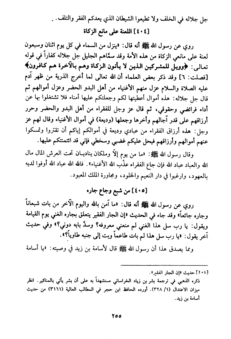 رُوِيَ عَن رَسُول الله صلى الله عَلَيْهِ وَسلم أَنه قَالَ (مَا آمن بِاللَّه وَالْيَوْم الآخر من بَات شبعانا وجاره جائعا) وَقد جَاءَ فِي الحَدِيث إِن الْجَار الْفَقِير يتَعَلَّق بجاره الْغَنِيّ يَوْم الْقِيَامَة وَيَقُول يَا رب سل هَذَا الْغَنِيّ لم مَنَعَنِي معروفه وسد بَابه دوني وَفِي حَدِيث آخر يَقُول يَا رب سل هَذَا لم بَات طاعما وَبت إِلَى جنبه طاويا
