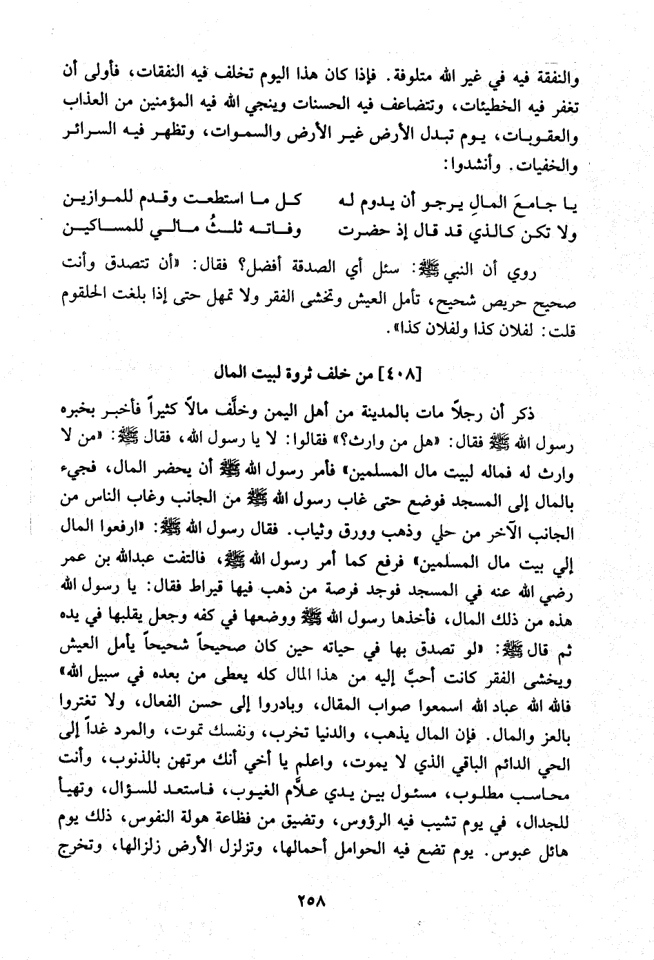 فَقَالَ رَسُول الله صلى الله عَلَيْهِ وَسلم (ارْفَعُوا المَال إِلَى بَيت مَال الْمُسلمين) فَرفع كَمَا أَمر رَسُول الله صلى الله عَلَيْهِ وَسلم فَالْتَفت عبد الله بن عمر رَضِي الله عَنهُ فِي الْمَسْجِد فَوجدَ فرْصَة من ذهب فِيهَا قِيرَاط فَقَالَ يَا رَسُول الله هَذِه من ذَلِك المَال فَأَخذهَا رَسُول الله صلى الله عَلَيْهِ وَسلم ووضعها فِي كَفه وَجعل يقلبها فِي يَده ثمَّ قَالَ صلى الله عَلَيْهِ وَسلم (لَو تصدق بهَا فِي حَيَاته حِين كَانَ صَحِيحا شحيحا يأمل الْعَيْش ويخشى الْفقر كَانَت أحب إِلَيْهِ من هَذَا المَال كُله يُعْطي من بعده فِي سَبِيل الله فَالله الله عباد الله اسمعوا صَوَاب الْمقَال وَبَادرُوا إِلَى حسن الفعال وَلَا تغتروا بالعز وَالْمَال