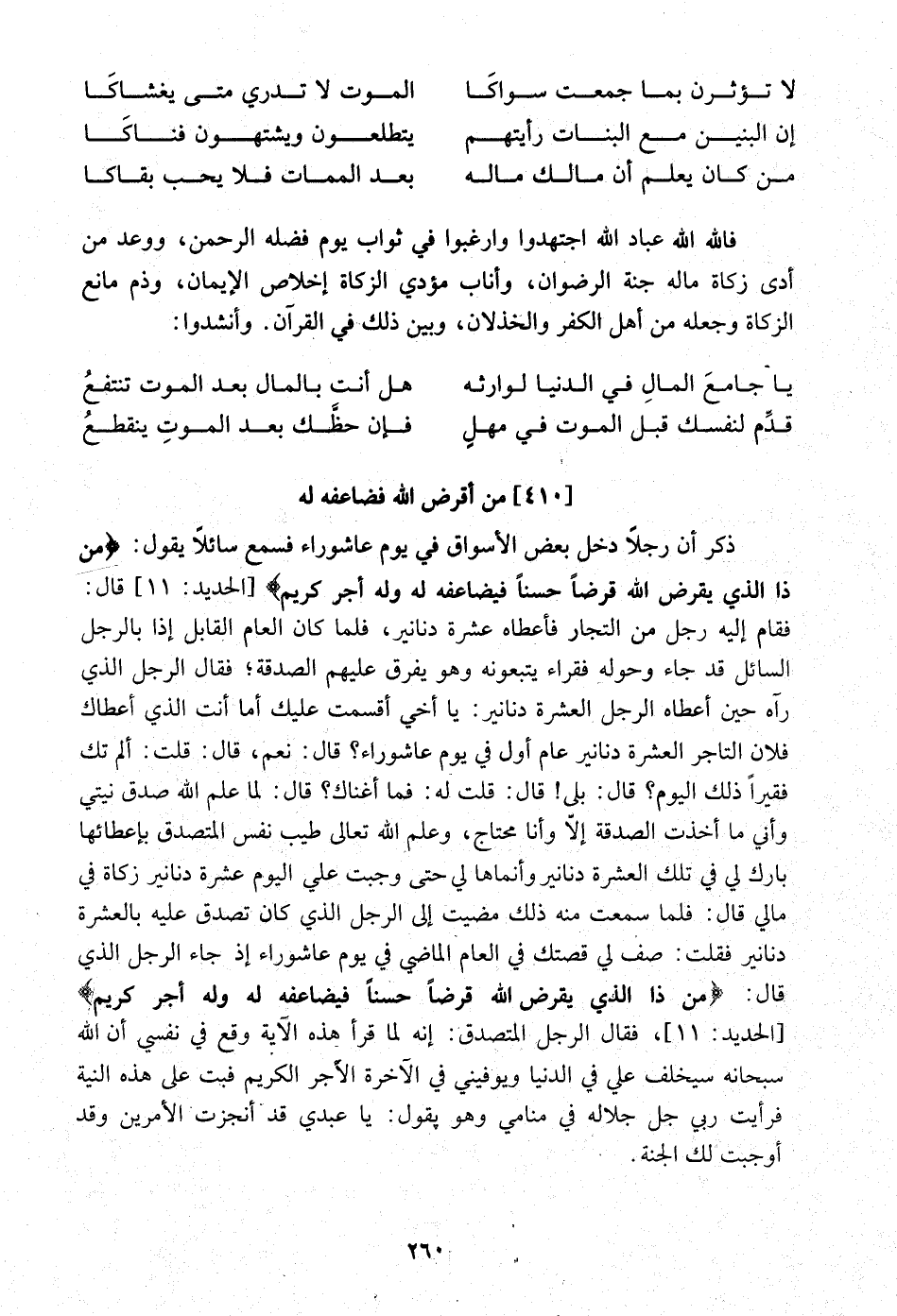 ذكر أَن رجلا دخل بعض الْأَسْوَاق فِي يَوْم عَاشُورَاء فَسمع سَائِلًا يَقُول {من ذَا الَّذِي يقْرض الله قرضا حسنا فيضاعفه لَهُ وَله أجر كريم} الْحَدِيد 11 قَالَ فَقَامَ إِلَيْهِ رجل من التُّجَّار فَأعْطَاهُ عشرَة دَنَانِير فَلَمَّا كَانَ الْعَام الْقَابِل إِذا بِالرجلِ السَّائِل قد جَاءَ وَحَوله فُقَرَاء يتبعونه وَهُوَ يفرق عَلَيْهِم الصَّدَقَة فَقَالَ الرجل الَّذِي رَآهُ حِين أعطَاهُ الرجل الْعشْرَة دَنَانِير يَا أخي أَقْسَمت عَلَيْك أما أَنْت الَّذِي أَعْطَاك فلَان التَّاجِر الْعشْرَة دَنَانِير عَام أول فِي يَوْم عَاشُورَاء قَالَ نعم قَالَ قلت ألم تَكُ فَقِيرا ذَلِك الْيَوْم قَالَ بلَى قَالَ قلت لَهُ فَمَا أَغْنَاك قَالَ لما علم الله صدق نيتي وَأَنِّي مَا أخذت الصَّدَقَة إِلَّا وَأَنا مُحْتَاج وَعلم الله تَعَالَى طيب نفس الْمُتَصَدّق بإعطائها بَارك لي فِي تِلْكَ الْعشْرَة دَنَانِير وأنماها لي حَتَّى وَجَبت عَليّ الْيَوْم عشرَة دَنَانِير زَكَاة فِي مَالِي قَالَ فَلَمَّا سَمِعت مِنْهُ ذَلِك مضيت إِلَى الرجل الَّذِي كَانَ تصدق عَلَيْهِ بِالْعشرَةِ دَنَانِير فَقلت صف لي قصتك فِي الْعَام الْمَاضِي فِي يَوْم عَاشُورَاء إِذْ جَاءَ الرجل الَّذِي قَالَ {من ذَا الَّذِي يقْرض الله قرضا حسنا فيضاعفه لَهُ وَله أجر كريم} الْحَدِيد 11 فَقَالَ الرجل الْمُتَصَدّق إِنَّه لما قَرَأَ هَذِه الْآيَة وَقع فِي نَفسِي أَن الله سُبْحَانَهُ سيخلف عَليّ فِي الدُّنْيَا ويوفيني فِي الْآخِرَة الْأجر الْكَرِيم فَبت على هَذِه النِّيَّة فَرَأَيْت رَبِّي جلّ جَلَاله فِي مَنَامِي وَهُوَ يَقُول يَا عَبدِي قد أنجزت الْأَمريْنِ وَقد أوجبت لَك الْجنَّة