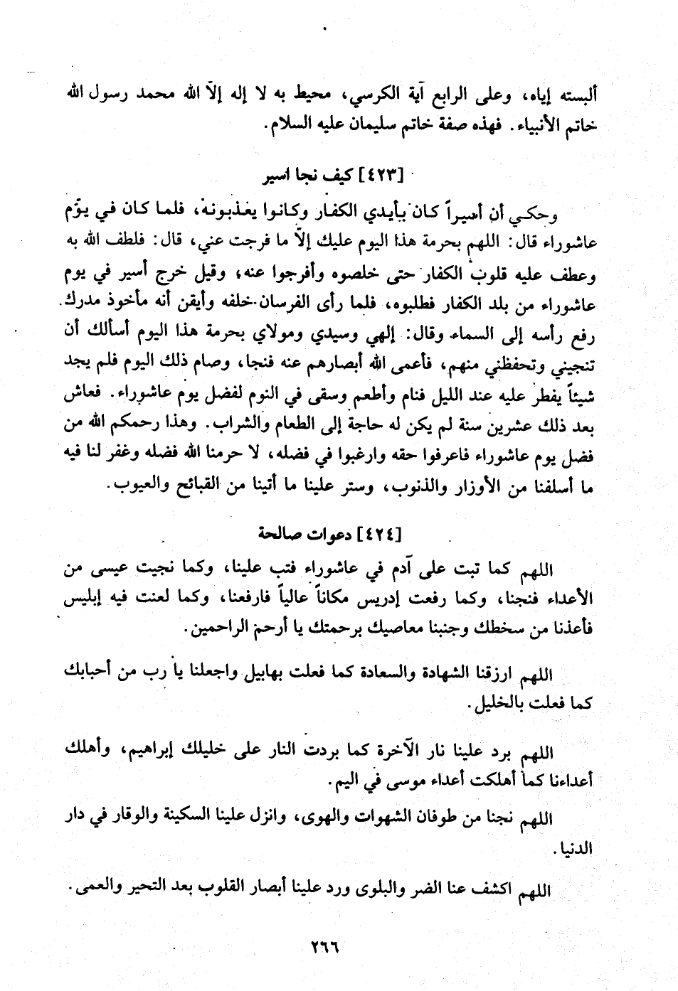 وَحكى أَن أَسِيرًا كَانَ بأيدي الْكفَّار وَكَانُوا يعذبونه فَلَمَّا كَانَ فِي يَوْم عَاشُورَاء قَالَ اللَّهُمَّ بِحرْمَة هَذَا الْيَوْم عَلَيْك إِلَّا مَا فرجت عني قَالَ فلطف الله بِهِ وَعطف عَلَيْهِ قُلُوب الْكفَّار حَتَّى خلصوه وأفرجوا عَنهُ وَقيل خرج أَسِير فِي يَوْم عَاشُورَاء من بلد الْكفَّار فطلبوه فَلَمَّا رأى الفرسان خَلفه وأيقن أَنه مَأْخُوذ مدرك رفع رَأسه إِلَى السَّمَاء وَقَالَ إلهي وسيدي ومولاي بِحرْمَة هَذَا الْيَوْم أَسأَلك أَن تنجيني وتحفظني مِنْهُم فَأعمى الله أَبْصَارهم عَنهُ فنجا وَصَامَ ذَلِك الْيَوْم فَلم يجد شَيْئا يفْطر عَلَيْهِ عِنْد اللَّيْل فَنَامَ وَأطْعم وَسَقَى فِي النّوم لفضل يَوْم عَاشُورَاء
