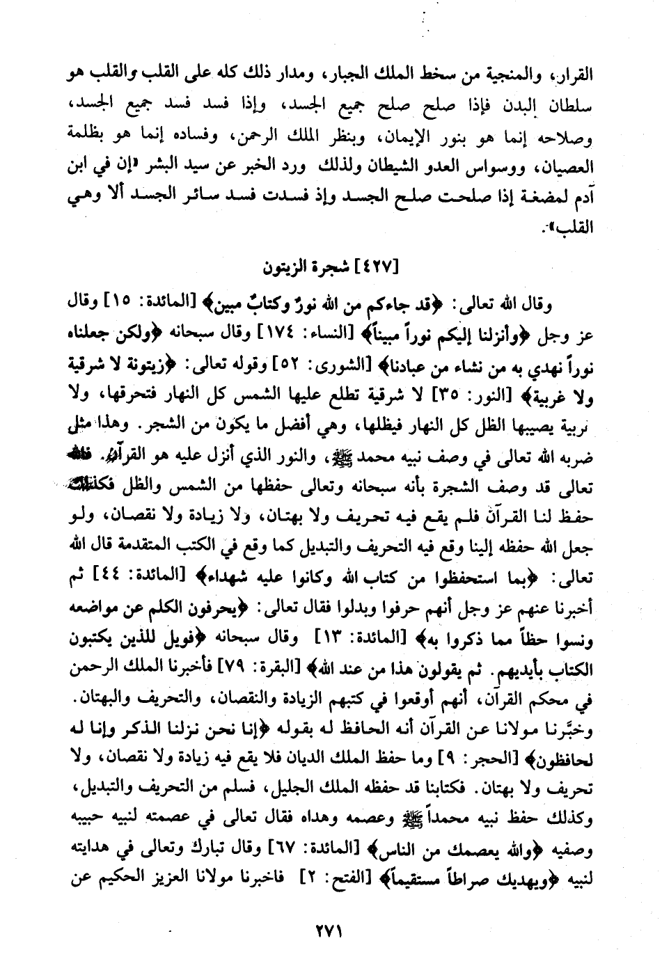وَقَالَ الله تَعَالَى {قد جَاءَكُم من الله نور وَكتاب مُبين} الْمَائِدَة 15 وَقَالَ عز وَجل {وأنزلنا إِلَيْكُم نورا مُبينًا} النِّسَاء 174 وَقَالَ سُبْحَانَهُ {وَلَكِن جَعَلْنَاهُ نورا نهدي بِهِ من نشَاء من عبادنَا} الشورى 52 وَقَوله تَعَالَى {زيتونة لَا شرقية وَلَا غربية} النُّور 35 لَا شرقية تطلع عَلَيْهَا الشَّمْس كل النَّهَار فتحرقها وَلَا غربية يُصِيبهَا الظل كل النَّهَار فيظلها وَهِي أفضل مَا يكون من الشّجر