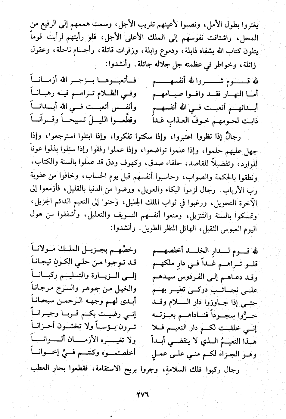 رجال إِذا نظرُوا اعتبروا وَإِذا سكتوا تَفَكَّرُوا وَإِذا ابتلوا استرجعوا وَإِذا جهل عَلَيْهِم حلموا وَإِذا علمُوا تواضعوا وَإِذا عمِلُوا رفقوا وَإِذا سئلوا بذلوا عونا للوارد وتفضيلا للقاصد حلفاء صدق وكهوف ودق قد عمِلُوا بِالسنةِ وَالْكتاب ونطقوا بالحكمة وَالصَّوَاب وحاسبوا أنفسهم قبل يَوْم الْحساب وخافوا من عُقُوبَة رب الأرباب