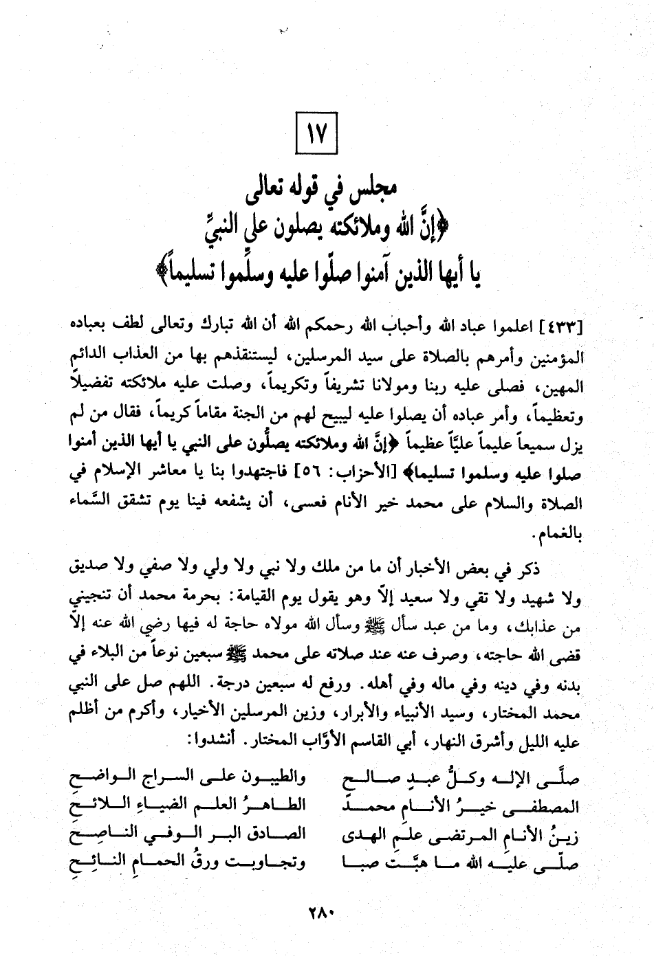 17 - مجْلِس فِي قَوْله تَعَالَى {إِن الله وَمَلَائِكَته يصلونَ على النَّبِي يَا أَيهَا الَّذين آمنُوا صلوا عَلَيْهِ وسلموا تَسْلِيمًا}