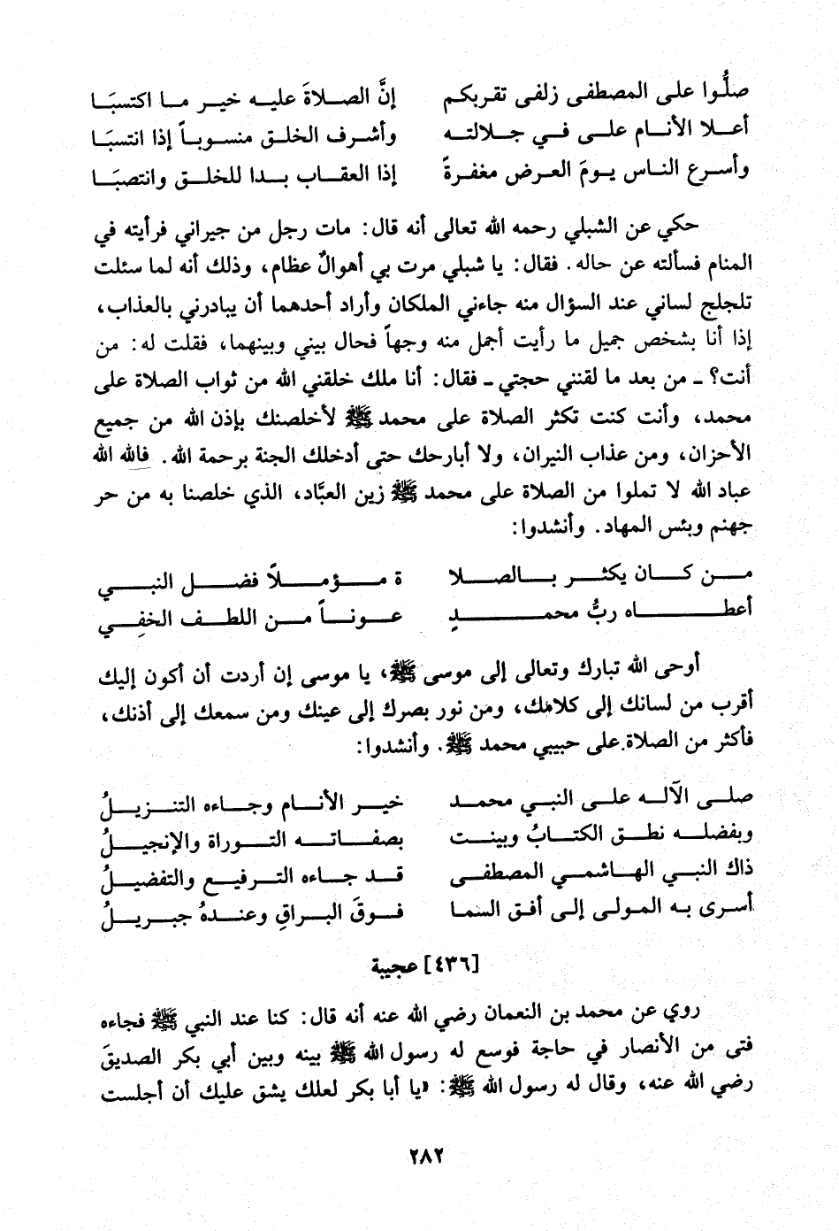 فَقَالَ يَا شبلي مرت بِي أهوال عِظَام وَذَلِكَ أَنه لما سُئِلت تلجلج لساني عِنْد السُّؤَال مِنْهُ جَاءَنِي الْملكَانِ وَأَرَادَ أَحدهمَا أَن يبادرني بِالْعَذَابِ إِذا أَنا بشخص جميل مَا رَأَيْت أجمل مِنْهُ وَجها فحال بيني وَبَينهمَا فَقلت لَهُ من أَنْت من بعد مَا لَقَّنَنِي حجتي فَقَالَ أَنا ملك خلقني الله من ثَوَاب الصَّلَاة على مُحَمَّد وَأَنت كنت تكْثر الصَّلَاة على مُحَمَّد صلى الله عَلَيْهِ وَسلم لأخلصنك بِإِذن الله من جَمِيع الأحزان وَمن عَذَاب النيرَان وَلَا ابارحك حَتَّى أدْخلك الْجنَّة برحمة الله