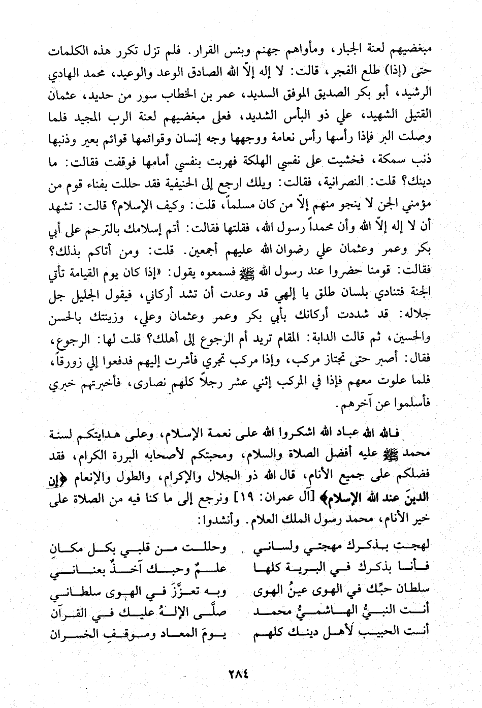 فَلم تزل تكَرر هَذِه الْكَلِمَات حَتَّى إِذا طلع الْفجْر قَالَت لَا إِلَه إِلَّا الله الصَّادِق الْوَعْد والوعيد مُحَمَّد الْهَادِي الرشيد أَبُو بكر الصّديق الْمُوفق السديد عمر بن الْخطاب سور من حَدِيد عُثْمَان الْقَتِيل الشَّهِيد عَليّ ذُو الْبَأْس الشَّديد فعلى مبغضيهم لعنة الرب الْمجِيد فَلَمَّا وصلت الْبر فَإِذا رَأسهَا رَأس نعَامَة ووجهها وَجه إِنْسَان وقوائمها قَوَائِم بعير وذنبها ذَنْب سَمَكَة فَخَشِيت على نَفسِي هالكة فهربت بنفسي أمامها فوقفت فَقَالَت مَا دينك قلت النَّصْرَانِيَّة فَقَالَت وَيلك ارْجع إِلَى الحنيفية فقد حللت بِفنَاء قوم من مؤمني الْجِنّ لَا ينجو مِنْهُم إِلَّا من كَانَ مُسلما قلت وَكَيف الْإِسْلَام قَالَت تشهد أَن لَا إِلَه إِلَّا الله وَأَن مُحَمَّدًا رَسُول الله فقلتها فَقَالَت أتم إسلامك بالترحم على أبي بكر وَعمر وَعُثْمَان وَعلي رضوَان الله عَلَيْهِم أَجْمَعِينَ