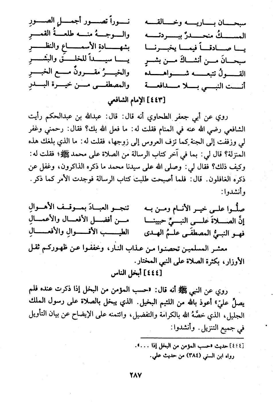 رُوِيَ عَن أبي جَعْفَر الطَّحَاوِيّ أَنه قَالَ قَالَ عبد الله بن عبد الحكم رَأَيْت الشَّافِعِي رَضِي الله عَنهُ فِي الْمَنَام فَقلت مَا فعل الله بك فَقَالَ رحمني وَغفر لي وزففت إِلَى الْجنَّة كَمَا تزف الْعَرُوس إِلَى زَوجهَا فَقلت لَهُ مَا الَّذِي بلغك هَذِه الْمنزلَة قَالَ لي بِمَا فِي آخر كتاب الرسَالَة من الصَّلَاة على مُحَمَّد صلى الله عَلَيْهِ وَسلم فَقلت لَهُ وَكَيف ذَلِك فَقَالَ لي وَصلى الله على سيدنَا مُحَمَّد مَا ذكره الذاكرون وغفل عَن ذكره الغافلون